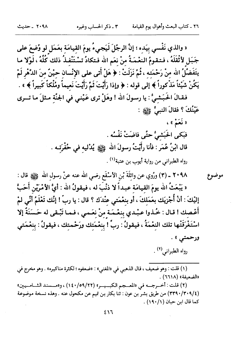 "والذي نَفْسي بِيَدِه؛ إنَّ الرجُلَ لَيَجيءُ يومَ القِيامَةِ بعَمَلٍ لو وُضعَ على جَبَل لأثْقَلَهُ، فتقومُ النعْمَةُ مِنْ نِعَم الله فتكادُ تسْتَنْفِذُ ذلك كُلَّهُ، لَوْلا ما يتَفَضَّلُ الله مِنْ رَحْمَتِهِ، ثُمَّ نَزَلَتْ: {هَلْ أَتَى عَلَى الْإِنْسَانِ حِينٌ مِنَ الدَّهْرِ لَمْ يَكُنْ شَيْئًا مَذْكُورًا} إلى قوله: {وَإِذَا رَأَيْتَ ثَمَّ رَأَيْتَ نَعِيمًا وَمُلْكًا كَبِيرًا} ".