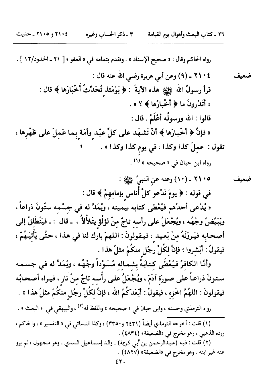 "فإنَّ {أَخْبَارَهَا} أنْ تَشهَد على كلِّ عبْدٍ وأمَةٍ بِما عَمِلَ على ظهْرِها، تقول: عمِلَ كذا وكذا، في يومِ كذا وكذا".