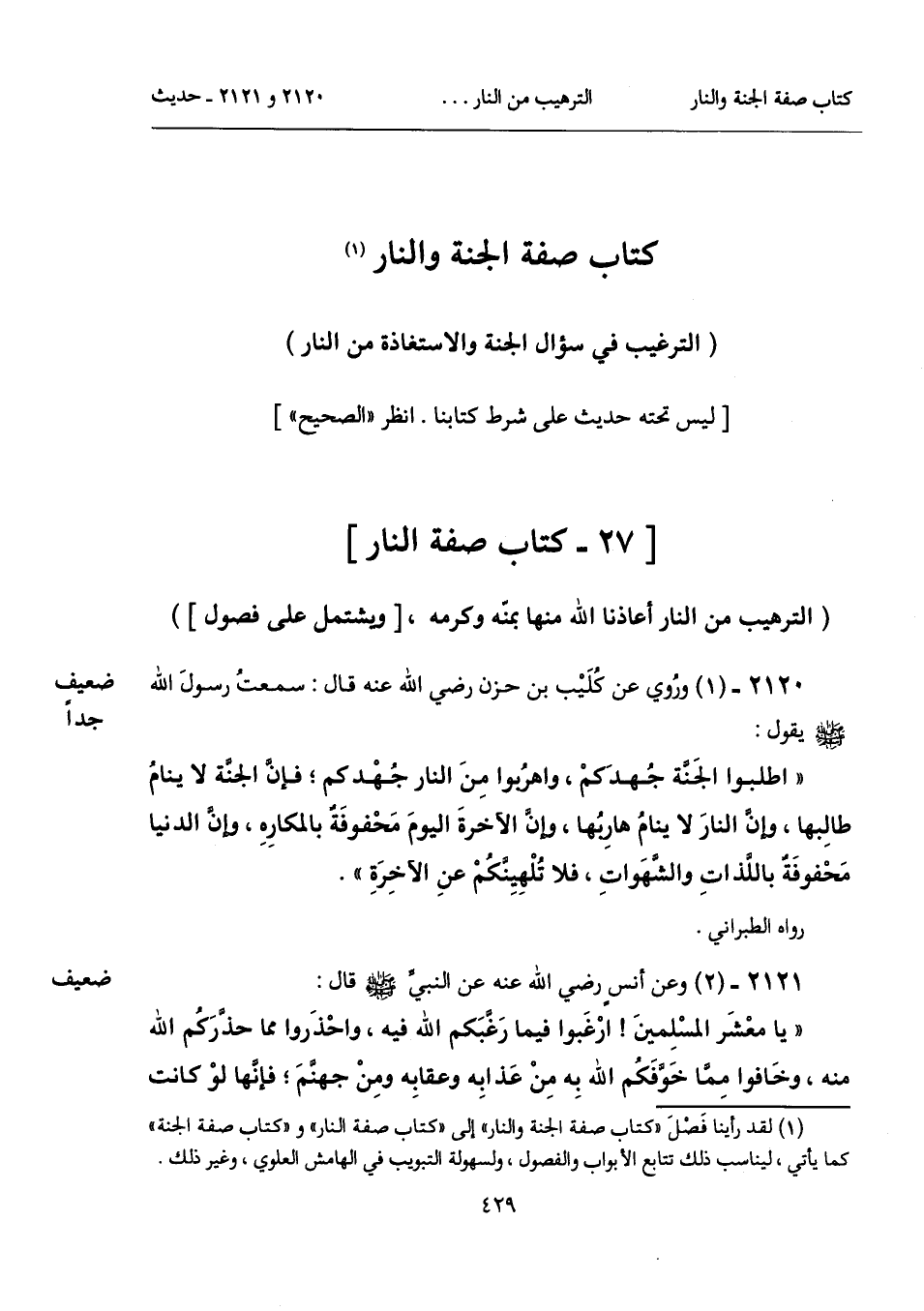 (¬1) لقد رأينا فَصْلَ "كتاب صفة الجنة والنار" إلى "كتاب صفة النار" و"كتاب صفة الجنة" كما يأتي، ليناسب ذلك تتابع الأبواب والفصول، ولسهولة التبويب في الهامش العلوي، وغير ذلك.