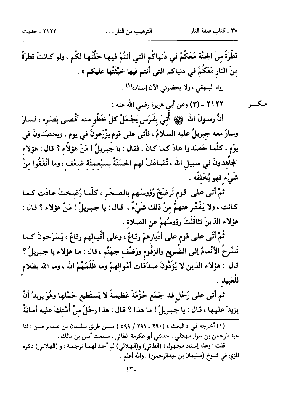 ثُمَّ أتَى على قومٍ على أدْبارِهمْ رقاعٌ، وعلى أقْبالِهم رقاعٌ، يَسْرَحونَ كما تَسْرحُ الأنْعامُ إلى الضريع والزقُّومِ ورَضْفِ جهَنَّم، قال: ما هؤلاء يا جبريلُ؟ قال: هؤلاء الذين لا يُؤَدُّونَ صدَقاتِ أمْوالِهمْ وما ظَلَمَهُمُ الله، وما الله بظلامٍ للْعَبيدِ.