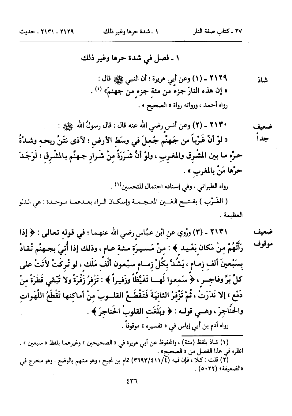 2131 - (3) [ضعيف موقوف] ورُوي عنِ ابْن عبَّاسٍ رضي الله عنهما؛ في قولهِ تعالى: {إِذَا رَأَتْهُمْ مِنْ مَكَانٍ بَعِيدٍ}: مِنْ مَسيرَةِ مئةِ عامٍ، وذلك إذا أُتِيَ بجهنَّم تُقادُ بِسَبْعينَ ألفِ زِمامٍ، يَشُدُّ بِكُلِّ زِمامٍ سبْعون ألْفِ مَلَكٍ، لو تُرِكَتْ لأَتَتْ على كلِّ بَرٍّ وفاجِرٍ، {سَمِعُوا لَهَا تَغَيُّظًا وَزَفِيرًا}: تَزْفِرُ زَفْرَةً ولا تُبْقي قَطْرَةً مِنْ دَمْعٍ؛ إلا نَدَرَتْ، ثُمَّ تَزْفِرُ الثانِيَةَ فَتَقْطَعُ القلوبَ مِنْ أماكِنها تَقْطَعُ اللَّهَواتِ والحنَاجِرَ، وهي قوله: {وَبَلَغَتِ الْقُلُوبُ الْحَنَاجِرَ}.