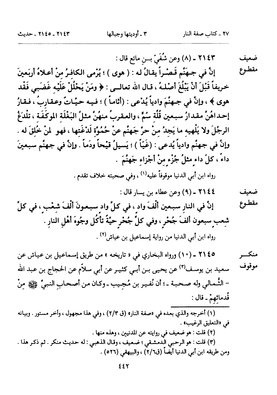إنَّ في جهَنَّم قَصْراً يقالُ له: (هوى)؛ يُرْمى الكافِرُ مِنْ أعلاهُ أربَعينَ خريفاً قَبْلَ أنْ يَبْلُغَ أصْلهُ، قال الله تعالى: {وَمَنْ يَحْلِلْ عَلَيْهِ غَضَبِي فَقَدْ هَوَى}، وإنَّ في جهنَّمَ وادياً يُدْعى: (أثاماً)؛ فيه حيَّاتٌ وعقارِبُ، فقارُ إحداهُنَّ مقدارُ سبعين قُلَّةِ سُمَّ، والعقربُ منهُنَّ مثلُ البَغْلَةِ الموكَفَةِ، تلْدَغُ الرجُلَ ولا يَلْهيهِ ما يَجِدُ مِنْ حرِّ جَهنَّم عنْ حُمُوَّةِ لَدْغَتِها، فهو لمنْ خُلِقَ له. وإنَّ في جهنَّم وادياً يُدعى: (غيّاً)؛ يَسيلُ قيْحًا ودَماً. وإنَّ في جهنَّم سبعينَ داءً، كلّ داءٍ مثلُ جُزْءٍ مِنْ أجْزاءٍ جَهنَّمَ.