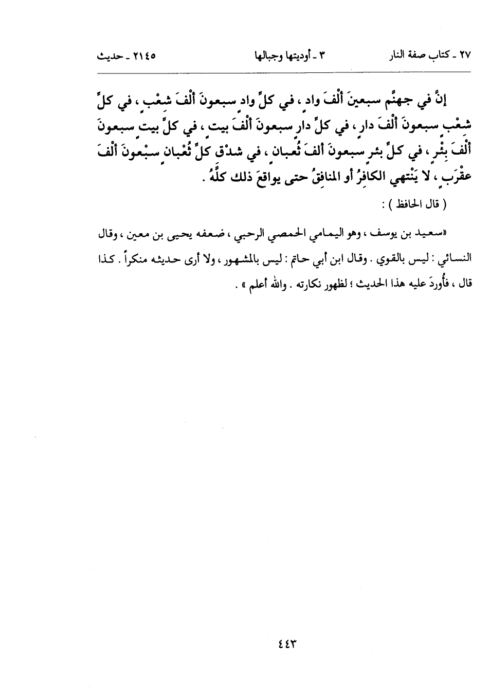 إنَّ في جهنَّم سبعينَ ألْفَ وادٍ، في كلِّ وادٍ سبعونَ ألْفَ شعْبٍ، في كلِّ شِعْبٍ سبعونَ ألْفَ دارٍ، في كلِّ دارٍ سبعونَ ألْفَ بيتٍ، في كلِّ بيتٍ سبعونَ ألْفَ بِئْرٍ، في كلِّ بئرٍ سبعونَ ألفَ ثُعبانٍ، في شدْق كلِّ ثُعْبانٍ سبْعونَ ألْفَ عقْرَبٍ، لا يَنْتهي الكافِرُ أو المنافِقُ حتى يواقعَ ذلك كلَّهُ.