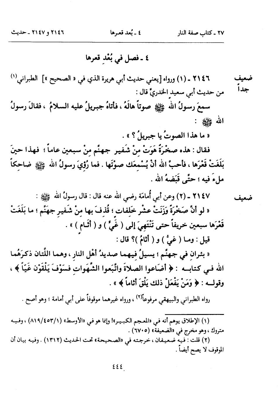 "بئرانِ في جهنَّم؛ يسيلُ فِيهما صديدُ أهْل النارِ، وهما اللَّتان ذكرَهُما الله في كتابه: {أَضَاعُوا الصَّلَاةَ وَاتَّبَعُوا الشَّهَوَاتِ فَسَوْفَ يَلْقَوْنَ غَيًّا}، وقوله: {وَمَنْ يَفْعَلْ ذَلِكَ يَلْقَ أَثَامًا} ".