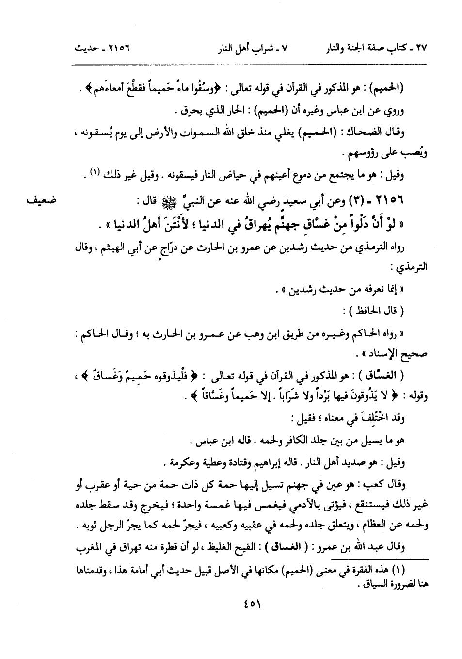 (الحميم): هو المذكور في القرآن في قوله تعالى: {وَسُقُوا مَاءً حَمِيمًا فَقَطَّعَ أَمْعَاءَهُمْ}.