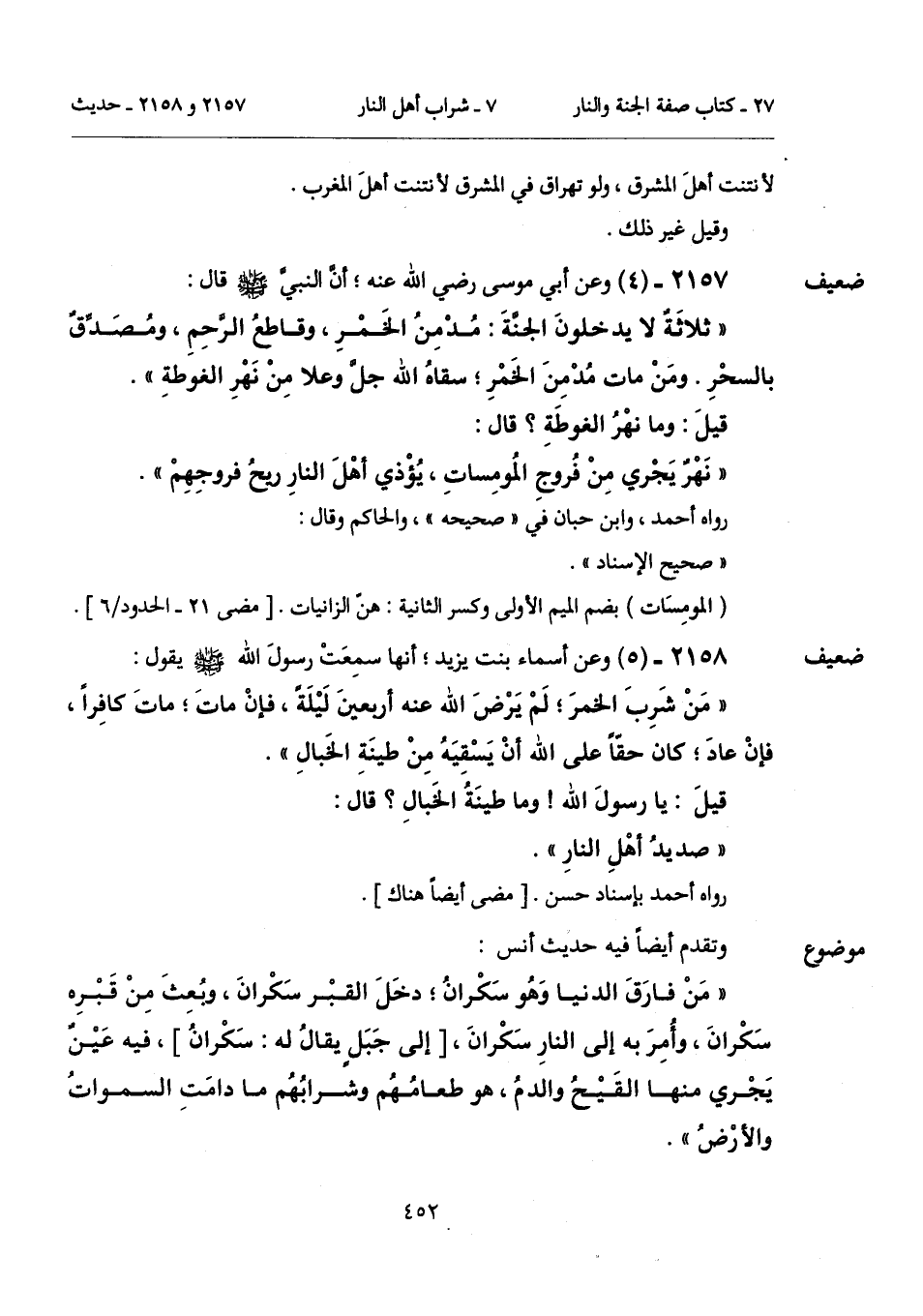 "ثلاثَةٌ لا يدخلونَ الجنَّةَ: مُدْمِنُ الخَمْرِ، وقاطعُ الرحِمِ، ومُصَدِّقٌ بالسحْرِ. ومَنْ مات مُدْمِنَ الخَمْرِ؛ سقاهُ الله جلَّ وعلا مِنْ نَهْرِ الغوطةِ".
