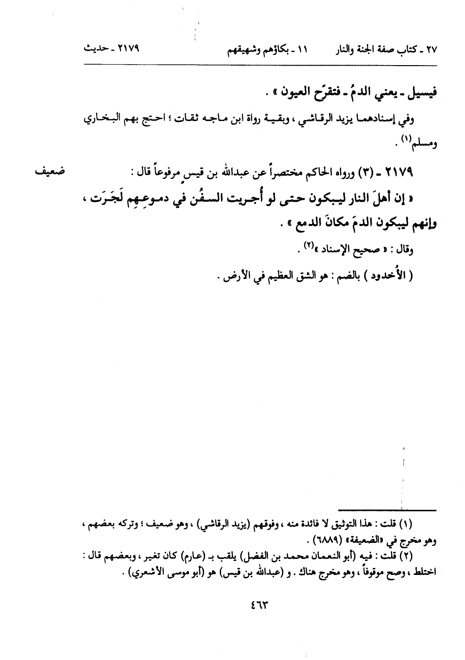 "إن أهلَ النار ليبكون حتى لو أُجريت السفُن في دموعِهِم لَجَرَت، وإنهم ليبكون الدمَ مكانَ الدمع".
