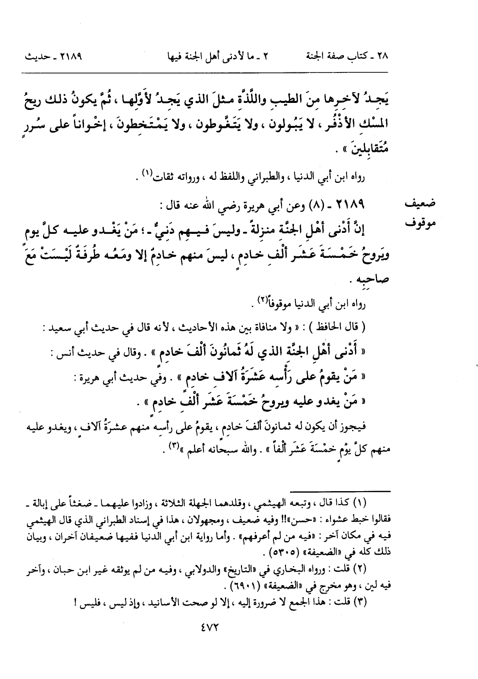 (¬1) كذا قال، وتبعه الهيثمي، وقلدهما الجهلة الثلاثة، وزادوا عليهما -ضغثاً على إبالة- فقالوا خبط عشواء: "حسن"!! وفيه ضعيف، ومجهولان، هذا في إسناد الطبراني الذي قال الهيثمي فيه في مكان آخر: "فيه من لم أعرفهم". وأما رواية ابن أبي الدنيا ففيها ضعيفان آخران، وبيان ذلك كله في "الضعيفة" (5305).