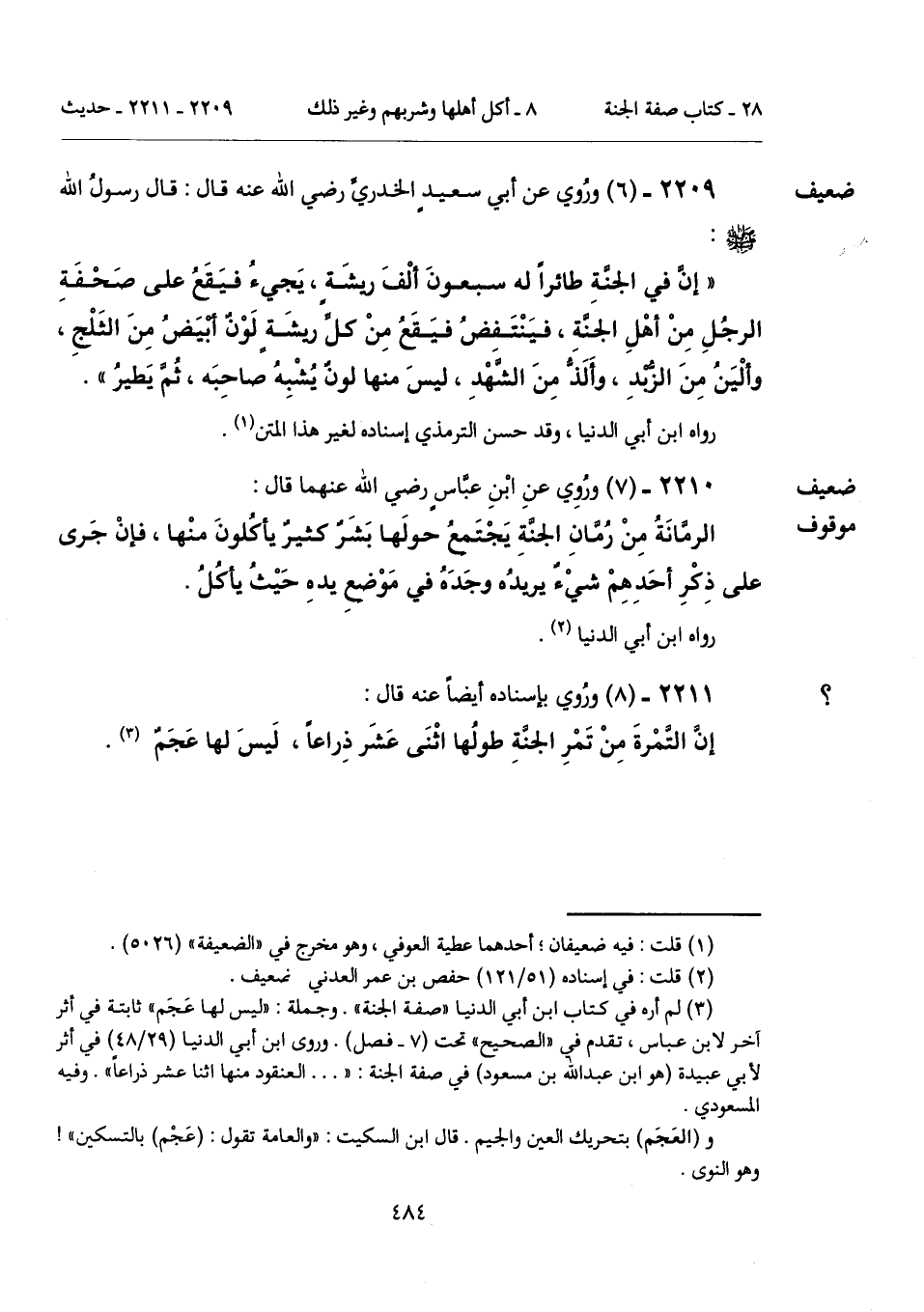 (¬3) لم أره في كتاب ابن أبي الدنيا "صفة الجنة". وجملة: "ليس لها عَجَم" ثابتة في أثر آخر لابن عباس، تقدم في "الصحيح" تحت (7 - فصل). وروى ابن أبي الدنيا (29/ 48) في أثر لأبي عبيدة (هو ابن عبد الله بن مسعود) في صفة الجنة: ". . . العنقود منها اثنا عشر ذراعاً". وفيه المسعودي.