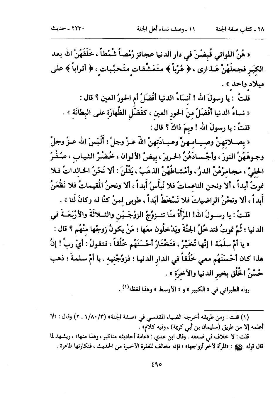 قلتُ: يا رسولَ الله! المرْأَةُ منّا تتزوَّجُ الزوْجَيْنِ والثلاثَةَ والأرْبَعَةَ في الدنيا؛ ثُمَّ تموتُ فتدخُلُ الجنَّةَ وَيَدْخلُون معَها؛ مَنْ يكونُ زوجُها مِنْهُم؟ قال: