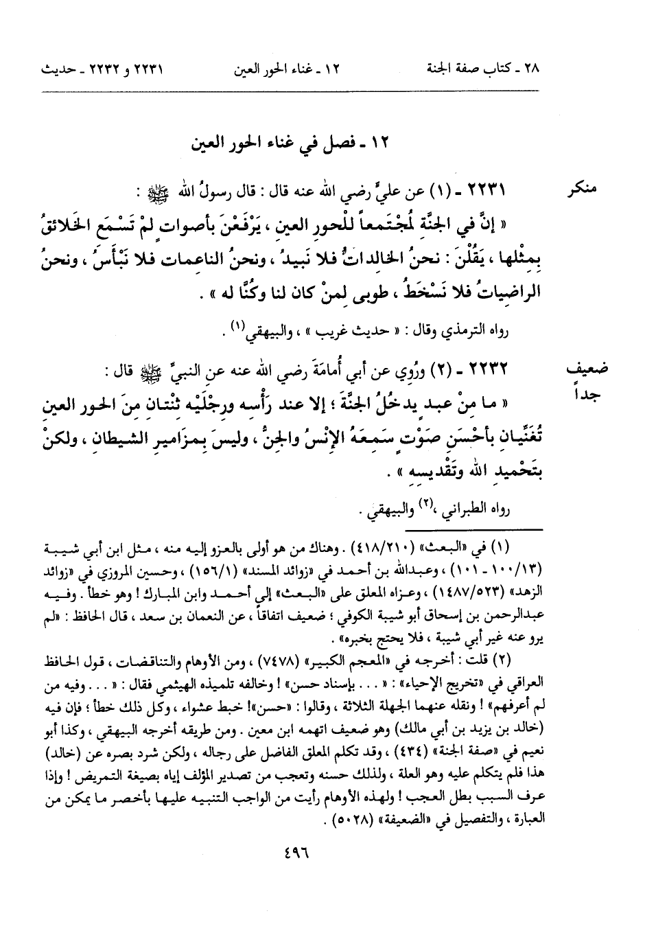 "ما مِنْ عبدٍ يدخُلُ الجنَّةَ؛ إلا عند رَأْسِه ورِجْلَيْه ثِنْتانِ مِنَ الحور العينِ تُغَنِّيانِ بأحْسَنِ صَوْتٍ سَمِعَهُ الإِنْسُ والجِنُّ، وليسَ بِمزَاميرِ الشيطانِ، ولكنْ بتَحْميدِ الله وتَقْديسِهِ".