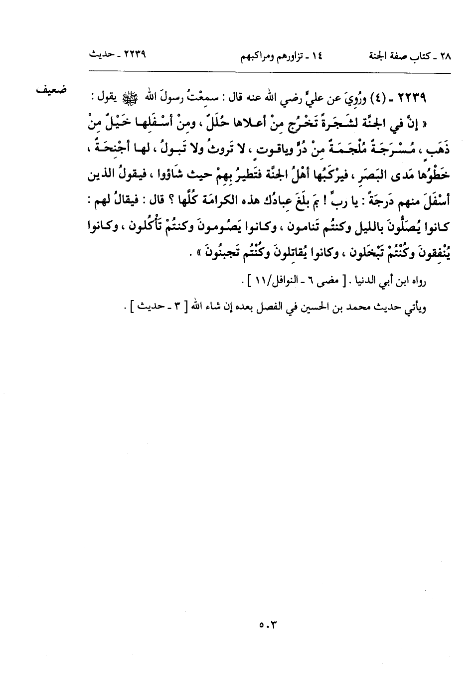 "إنَّ في الجنَّة لشَجَرةً تَخْرُج مِنْ أعلاها حُلَلٌ، ومِنْ أسْفَلِها خَيْلٌ مِنْ ذَهَبٍ، مُسْرَجَةٌ مُلْجَمَةٌ مِنْ دُرٍّ وياقوتٍ، لا تَروثُ ولا تَبولُ، لها أجْنِحَةٌ، خَطْوُها مَدى البَصَرِ، فيرْكَبُها أهْلُ الجنَّة فتَطيرُ بِهِمْ حيث شَاؤوا، فيقولُ الذين أسْفَلَ منهم دَرجَةً: يا ربِّ! بمَ بلَغَ عِبادُك هذه الكرامَة كُلُّها؟ قال: فيقالُ لهم: