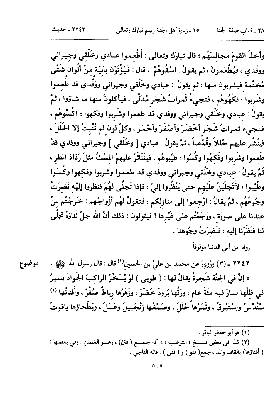 وأَخذَ القومُ مجالِسَهُم؛ قال تبارَك وتعالى: أَطْعِموا عبادي وخَلْقِي وجِيرِاني ووفْدي، فيُطْعَمونَ، ثم يقولُ: اسْقُوهُمْ، قال: فَيُؤْتَوْن بآنِيَةٍ مِنْ ألْوانٍ شتَّى مُختَّمةٍ فيشربون منها، ثم يقولُ: عبادي وخَلْقي وجيراني ووَفْدي قد طَعِموا وشَرِبوا؛ فكِّهُوهُم، فتجيءُ ثَمراتُ شَجَرٍ مُدَلَّى، فيأكلونَ منها ما شاؤوا، ثمَّ يقولُ: عِبادي وخَلْقي وجيراني ووفدي قد طعموا وشَرِبوا وفكهوا؛ اكْسُوهُم، فتجيء ثمراتُ شَجَرٍ أخْضَرَ وأصْفَرَ وأحْمَر، وكلِّ لونٍ لم تُنْبِتُ إلا الحُلَلَ، فينْشُر عليهم حُللاً وقمُصاً، ثمَّ يقولُ: عبادي [وخَلْقي] وجيراني ووفدي قدْ طَعِموا وشَرِبوا وفَكِهُوا وكُسُوا؛ طيِّبوهُم، فيتَنَاثَرُ عليهمُ المِسْكُ مثلَ رَذاذ المطرِ، ثمَّ يقولُ: عِبادي وخَلْقي وجيراني ووفدي قد طعموا وشربوا وفكِهوا وكُسُوا وطُيِّبوا؛ لأَتَجلَّيَنَّ علَيْهِم حتى يَنْظُروا إليَّ، فإذا تَجلَّى لهُمْ فنظروا إليْهِ نَضِرَتْ وجُوهُهُم، ثمَّ يقالُ: ارْجِعوا إلى منازِلِكم، فتقولُ لَهُم أزْواجُهم: خَرجْتُم مِنْ عندنا على صورَةٍ، ورَجَعْتُم على غَيْرِها! فيقولون: ذلك أنَّ الله جلَّ ثَناؤهُ تجلَّى لنا فنَظَرْنا إليْه، فنَضِرَتْ وجُوهنا.