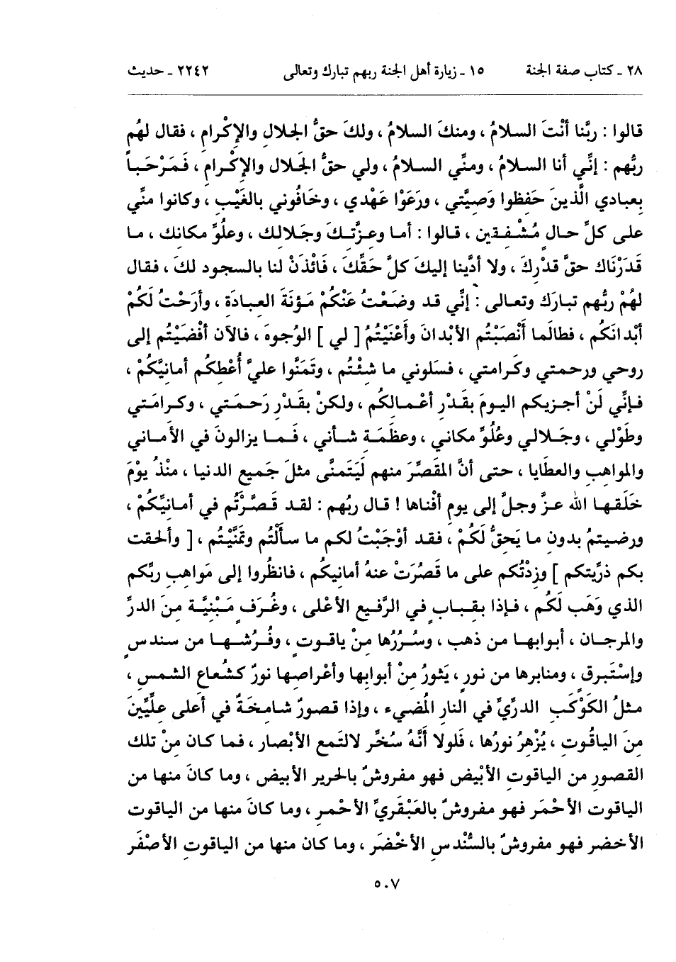 قالوا: ربَّنا أنْتَ السلامُ، ومنكَ السلامُ، ولكَ حقُّ الجلالِ والإِكْرامِ، فقال لهُمٍ ربُّهم: إنِّي أنا السلامُ، ومنِّي السلامُ، ولي حقُّ الجَلال والإِكْرامِ، فَمَرْحَباً بِعبادي الَّذينَ حَفِظوا وَصِيَّتي، ورَعَوْا عَهْدي، وخَافُوني بالغَيْبِ، وكانوا منِّي على كلِّ حالٍ مُشْفِقين، قالوا: أما وعِزَّتِكَ وجَلالِك، وعلُوِّ مكانِك، ما قَدَرْنَاك حقَّ قدْرِكَ، ولا أدَّينا إليكَ كلَّ حَقِّكَ، فَائْذَنْ لنا بالسجود لكَ، فقال لهُمْ ربُّهم تبارَك وتعالى: إنِّي قد وضَعْتُ عَنْكُمْ مَؤنَةَ العِبادَةِ، وأرَحْتُ لَكُمْ أبْدانَكُم، فطالَما أَنْصَبْتُم الأبْدانَ وأَعْنَيْتُمُ [لي] الوُجوهَ، فالآن أفْضَيْتُم إلى روحي ورحمتي وكَرامتي، فسَلوني ما شِئْتُم، وتَمَنَّوا عليَّ أُعْطِكُم أمانِيَّكُمْ، فإنِّي لَنْ أجزيكم اليومَ بقَدْرِ أعْمالِكُم، ولكنْ بقَدْرِ رَحمَتي، وكرامَتي وطَوْلي، وجَلالي وعُلُوِّ مكاني، وعظَمَةِ شأني، فَما يزالونَ في الأَماني والمواهِبِ والعطَايا، حتى أنَّ المقَصِّرَ منهم لَيَتَمنَّى مثلَ جَميعِ الدنيا، منْذُ يوْمَ خَلَقها الله عزَّ وجلَّ إلى يومِ أفْناها! قال ربُهم: لقد قَصَّرْتُم في أمانيِّكُمْ، ورضيتمُ بدونِ ما يَحِقُّ لَكُمْ، فقد أوْجَبْتُ لكم ما سأَلْتُم وتمَنَّيْتُم، [وأَلحقت بكم ذرَّيتكم] وزِدْتُكم على ما قَصُرَتْ عنهُ أمانِيكُم، فانظُروا إلى مَواهِبِ ربِّكم الذي وَهَب لَكُم، فإذا بقِبابٍ في الرَّفيع الأعْلى، وغُرَفٍ مَبْنِيَّة مِنَ الدرِّ والمرجان، أبوابها من ذهب، وسُرُرُها منْ ياقوتٍ، وفُرُشها من سندسٍ وإسْتَبرقٍ، ومنابرها من نورٍ، يَثورُ مِنْ أبوابَها وأعْراصِها نورٌ كشُعاعِ الشمسِ، مثلُ الكَوْكَبِ الدرِّيِّ في النارِ المُضيء، وإذا قصورٌ شامِخَةٌ في أعَلى عِلِّيِّينَ مِنَ الياقُوتِ، يُزْهِرُ نورُها، فَلولا أَنَّهُ سُخِّر لالتَمع الأبْصار، فما كان مِنْ تلك القصورِ من الياقوتِ الأبْيض فهو مفروشٌ بالحرير الأبيض، وما كانَ منها من الياقوت الأحْمَر فهو مفروشٌ بالعَبْقَريِّ الأحْمرِ، وما كانَ منها من الياقوت الأخضر فهو مفروشٌ بالسُّنْدسِ الأخْضَر، وما كان منها من الياقوتِ الأصْفَر