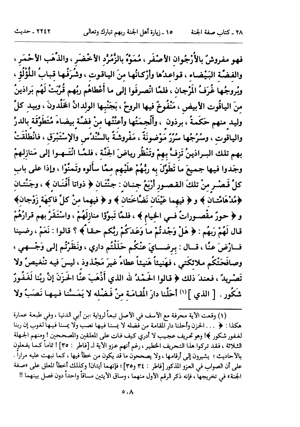 (¬1) وقعت الآية محرفة مع الأسف في الأصل تبعاً لرواية ابن أبي الدنيا، وفي طبعة عمارة هكذا: {. . . الحزن وأحلنا دار المقامة من فضله لا يمسنا فيها نصب ولا يمسنا فيها لغوب إن ربنا لغفور شكور}! وهو تحريف عجيب لا أدري كيف فات على المعلقين والمصححين! ومنهم الجهلة الثلاثة، فقد تركوا هذا التحريف الخطير، رغم أنهم عزو الآية لـ[فاطر: 135]! تماماً كما يفعلون بالأحاديث؛ يشيرون إلى أرقامها, ولا يصححون ما قد يكون من خطأ فيها، كما نبهت عليه مراراً. على أن الصواب في العزو المذكور [فاطر: 34 و35]؛ فإنهما آيتان! وكذلك أخطأ المعلق على "صفة الجنة" في تخريجها، فإنه ذكر الرقم الأول منهما، وساق الآيتين مساقاً واحداً دون فصل بينهما!!