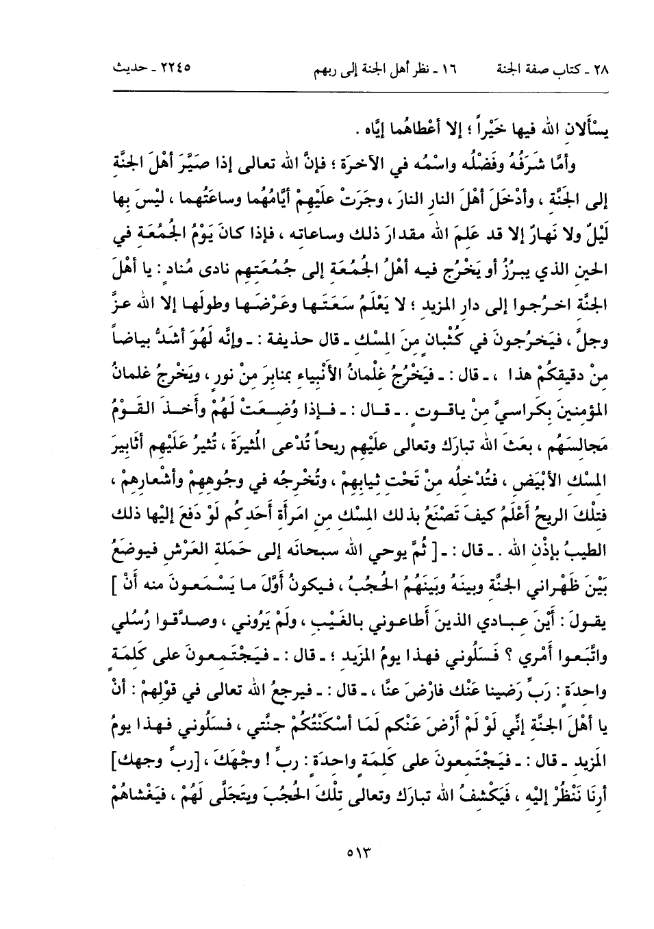 وأمَّا شَرَفُهُ وفَضْلُه واسْمُه في الآخرَة؛ فإنَّ الله تعالى إذا صَيَّرَ أهْلَ الجنَّةِ إلى الجَنَّةِ، وأدْخَلَ أهْلَ النارِ النارَ، وجَرَتْ علَيْهِمْ أيَّامُهُما وساعَتُهما، ليْسَ بِها لَيْلٌ ولا نَهارٌ إلا قد عَلِمَ الله مقدارَ ذلك وساعاتِه، فإذا كانَ يَوْمُ الجُمُعَةِ في الحينِ الذي يبرُزُ أو يَخْرُج فيه أهْل الجُمْعَةِ إلى جُمُعَتِهِم نادى مُنادٍ: يا أهْلَ الجنَّة اخرُجوا إلى دارِ المزيدِ؛ لا يَعْلَمُ سَعَتَها وعَرْضَها وطولَها إلا الله عزَّ وجلَّ، فيَخرُجونَ في كُثْبانٍ مِنَ المِسْكِ -قال حذيفة:- وإنَّه لَهُوَ أشَدُّ بياضاً مِنْ دقيقِكُمْ هذا، -قال:- فيَخْرُجُ غِلْمانُ الأَنْبِياءِ بمنابِرَ مِنْ نورٍ، وَيَخْرجُ غلمانُ المؤمِنينَ بِكَراسيَّ مِنْ ياقوتٍ. -قال:- فإذا وُضِعَتْ لَهُمْ وأَخذَ القَوْمُ مَجالِسَهُم، بعَثَ الله تبارَك وتعالى علَيْهِم ريحاً تُدْعى المُثيرَةَ، تُثيرُ عَلَيْهِم أثَابِيرَ المِسْكِ الأبْيَضِ، فتُدْخِلُه مِنْ تَحْتِ ثِيابِهِمْ، وتُخْرِجُه في وجُوهِهِمْ وأشْعارِهِمْ، فتِلْكَ الريحُ أَعْلَمُ كيفَ تَصْنَعُ بذلك المِسْكِ مِنِ امَرأَةِ أَحَدِكم لَوْ دَفعَ إليْها ذلك الطيبُ بإذْنِ الله. -قال:-[ثُمَّ يوحي الله سبحانَه إلى حَمَلةِ العَرْشِ فيوضَعُ بَيْنَ ظَهْراني الجنَّةِ وبينَهُ وبَينَهُمُ الحُجُبُ، فيكون أَوَّلَ ما يَسْمَعونَ منه أَنْ] يقولَ: أَيْنَ عِبادي الذينَ أَطاعوني بالغَيْبِ، ولَمْ يَرُوني، وصدَّقوا رُسُلي واتَّبَعوا أَمْري؟ فَسَلُوني فهذا يومُ المزَيدِ؛ -قال:- فيَجْتَمِعونَ على كَلِمَةٍ واحِدَةٍ: رَبِّ رَضينا عَنْك فارْضَ عنَّا، -قال:- فيرجعُ الله تعالى في قوْلِهمْ: أنْ يا أهْلَ الجنَّةِ إنِّي لَوْ لَمْ أَرْضَ عَنْكم لَمَا أسْكَنْتُكُمْ جنَّتي، فسَلُوني فهذا يومُ المَزيدِ -قال:- فيَجْتَمِعونَ على كَلِمَةٍ واحِدَةٍ: ربِّ! وجْهَكَ، [ربِّ وجهك] أرِنَا نَنْظُرْ إليْهِ، فَيَكْشِفُ الله تبارَك وتعالى تِلْكَ الحُجُبَ ويتَجَلَّى لَهُمْ، فيَغْشاهُمْ