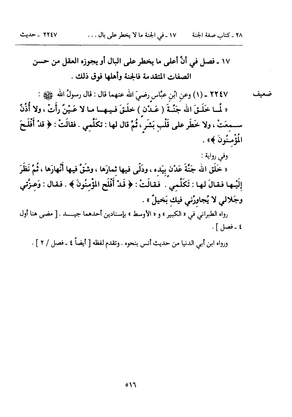"خَلَق الله جَنَّةَ عَدْنٍ بِيَدِه، ودَلّى فيها ثِمارَها، وشَقَّ فيها أَنْهارَها، ثُمَّ نَظَرَ إِلَيْها فقالَ لها: تَكَلَّمِي. فقالَتْ: {قَدْ أَفْلَحَ الْمُؤْمِنُونَ}. فقال: وَعِزَّتي وجَلالي لا يُجاوِرُني فيكِ بَخيلٌ".