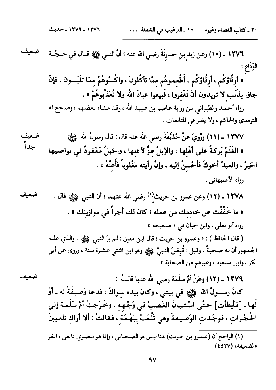 1376 - (10) [ضعيف] وعن زيدٍ بنِ حارِثَة رضي الله عنه؛ أنَّ النبي - صلى الله عليه وسلم - قال في حَجَّةِ الوَدَاعِ:
