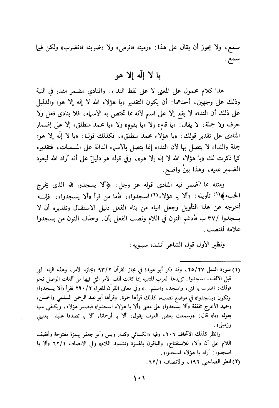 ومثله مما أضمر فيه المنادى قوله عز وجل: {ألا يسجدوا لله الذي يخرج الخبء} تأويله: «ألا يا هؤلاء اسجدوا» فأما من قرأ «ألا يسجدوا»، فإنه أخرجه عن هذا التأويل وجعل الياء من بناء الفعل دليل الاستقبال وتقديره أن لا يسجدوا فأدغم النون في اللام ونصب الفعل بأن. وحذف النون من يسجدوا علامة للنصب.
