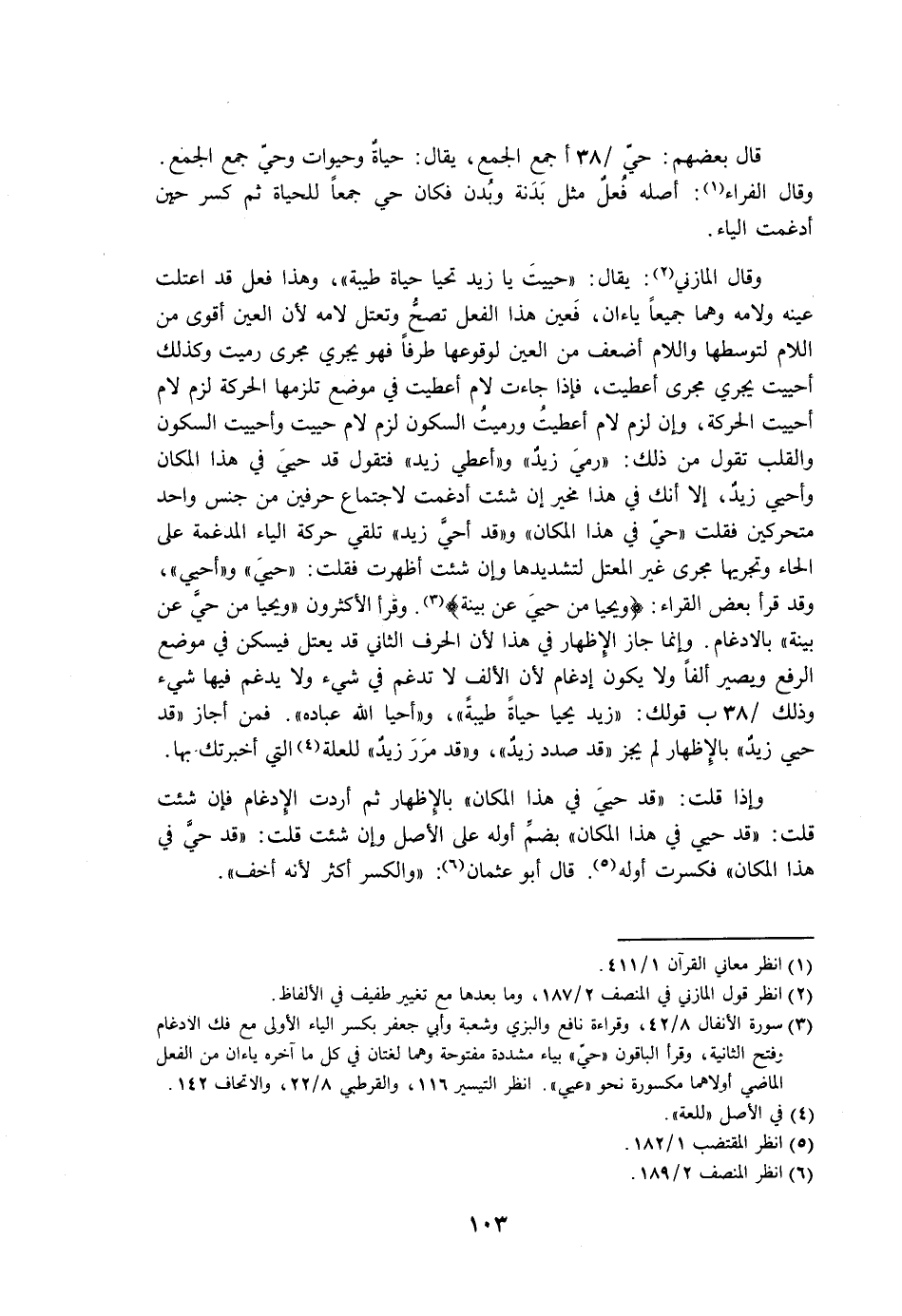 وقال المازني: يقال: «حييت يا زيد تحيا حياة طيبة»، وهذا فعل قد اعتلت عينه ولامه وهما جميعًا ياءان، فعين هذا الفعل تصح وتعتل لامه لأن العين أقوى من اللام لتوسطها واللام أضعف من العين لوقوعها طرفًا فهو يجري مجرى رميت وكذلك أحييت يجري مجرى أعطيت، فإذا جاءت لام أعطيت في موضع تلزمها الحركة لزم لام أحييت الحركة، وإن لزم لام أعطيت ورميت السكون لزم لام حييت وأحييت السكون والقلب تقول من ذلك: «رمي زيد» و «أعطي زيد» فتقول قد حيي في هذا المكان وأحيي زيد، إلا أنك في هذا مخير إن شئت أدغمت لاجتماع حرفين من جنس واحد متحركين فقلت «حي في هذا المكان» و «قد أحي زيد» تلقي حركة الياء المدغمة على الحاء وتجريها مجرى غير المعتل لتشديدها وإن شئت أظهرت فقلت: «حي» و «أحيي»، وقد قرأ بعض القراء: {ويحيا من حيي عن بينة}. وقرأ الأكثرون «ويحيا من حي عن بينة» بالإدغام. وإنما جاز الإظهار في هذا لأن الحرف الثاني قد يعتل فيسكن في موضع الرفع ويصير ألفًا ولا يكون إدغام لأن الألف لا تدغم في شيء ولا يدغم فيها شيء وذلك قولك: «زيد يحيا حياة طيبة»، و «أحيا الله عباده». فمن أجاز «قد حيي زيد» بالإظهار لم يجز «قد صدد زيد»، و «قد مرر زيد» للعلة التي أخبرتك بها.