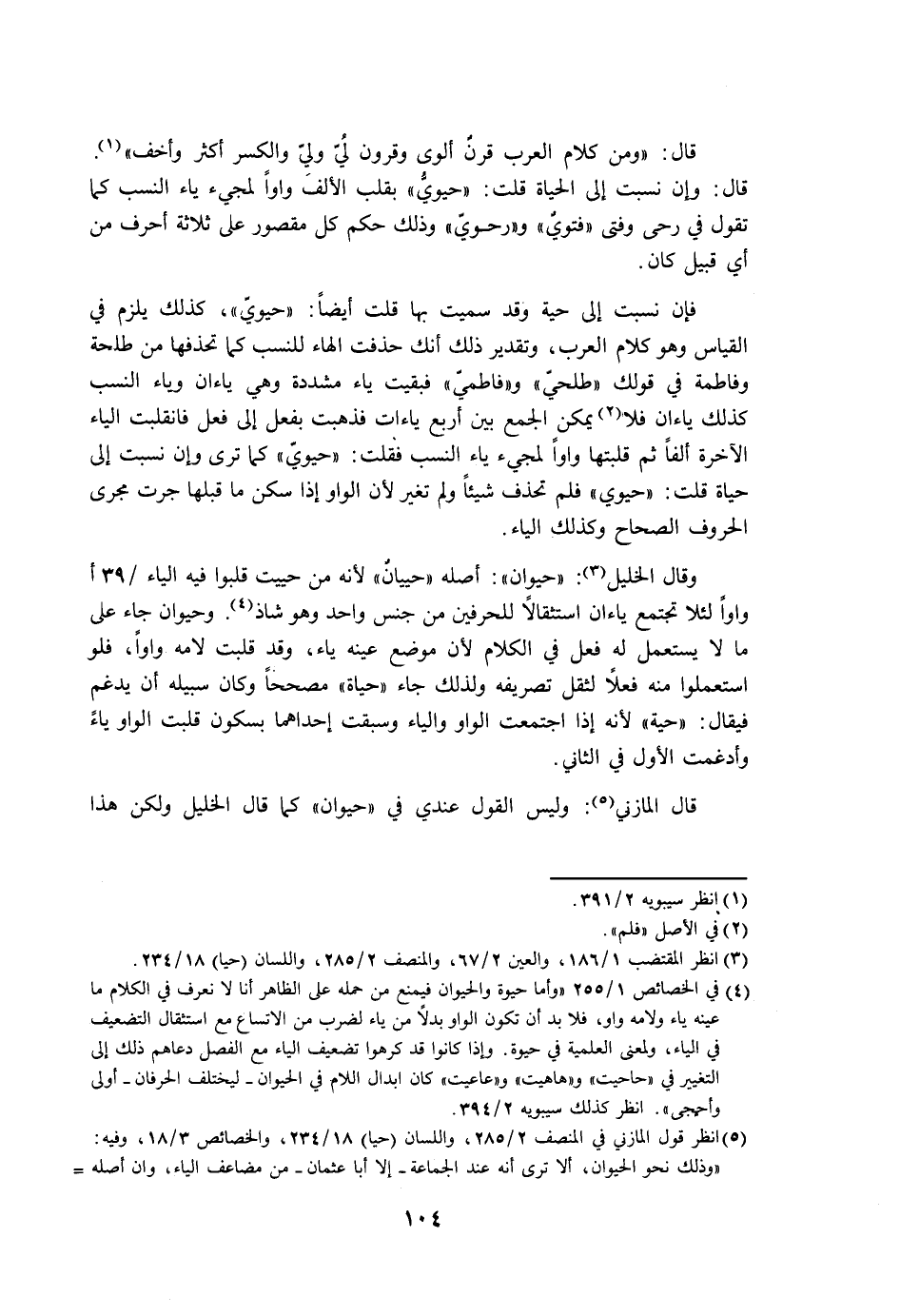 فإن نسبت إلى حية وقد سميت بها قلت أيضًا: «حيوي»، كذلك يلزم في القياس وهو كلام العرب، وتقدير ذلك أنك حذفت الهاء للنسب كما تحذفها من طلحة وفاطمة في قولك «طلحي» و «فاطمي» فبقيت ياء مشددة وهي ياءان وياء النسب كذلك ياءان فلا يمكن الجمع بين أربع ياءات فذهبت بفعل إلى فعل فانقلبت الياء الآخرة ألفًا ثم قلبتها واوًا لمجيء ياء النسب فقلت: «حيوي» كما ترى وإن نسبت إلى حياة قلت: «حيوي» فلم تحذف شيئًا ولم تغير لأن الواو إذا سكن ما قبلها جرت مجرى الحروف الصحاح وكذلك الياء.