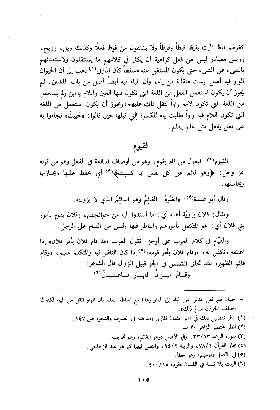وقال أبو عبيدة: «القيوم: القائم وهو الدائم الذي لا يزول».