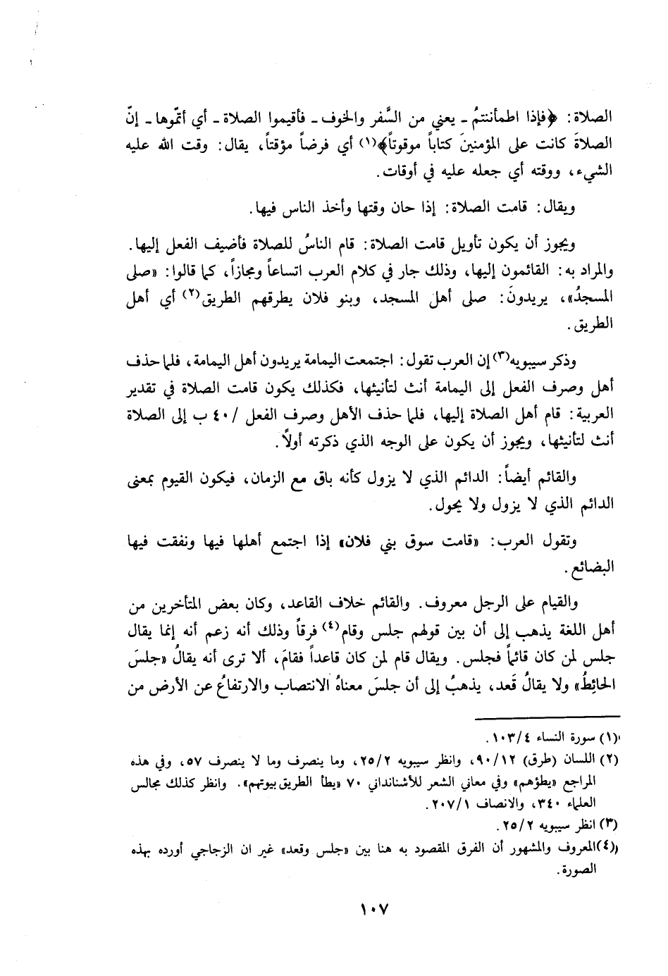 الصلاة: {فإذا اطمأننتم - يعني من السفر والخوف - فأقيموا الصلاة - أي أتموها - إن الصلاة كانت على المؤمنين كتابا موقوتا} أي فرضًا مؤقتًا، يقال: وقت الله عليه الشيء، ووقته أي جعله عليه في أوقات.