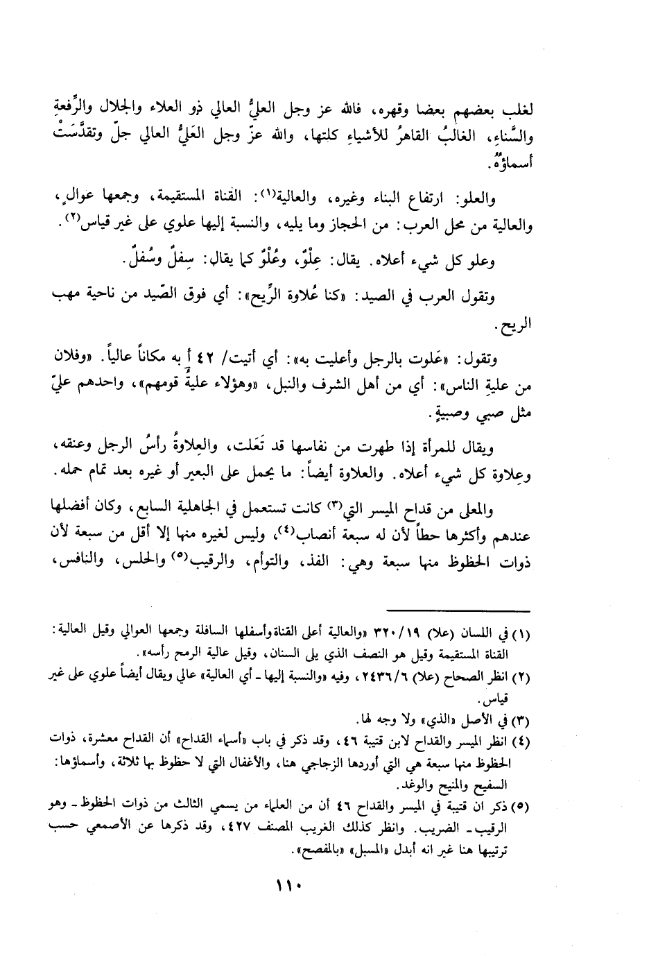 وتقول: «علوت بالرجل وأعليت به»: أي أتيت به مكانًا عاليصا. «وفلان من علية الناس»: أي من أهل الشرف والنبل، «وهؤلاء علية قومهم»، واحدهم علي مثل صبي وصبية.