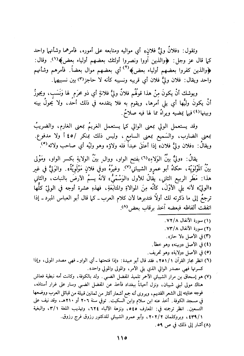 وتقول: «فلان ولي فلان» أي مواليه ومتابعه على أموره، فأمرهما وشأنهما واحد كما قال عز وجل: {والذين آووا ونصروا أولئك بعضهم أولياء بعض}. وقال: {والذين كفروا بعضهم أولياء بعض} أي بعضهم موال بعضًا. فأمرهم وشأنهم واحد ويقال: فلان ولي فلان أي قريبه ونسيبه كأنه لا حاجز بين نسبيهما.