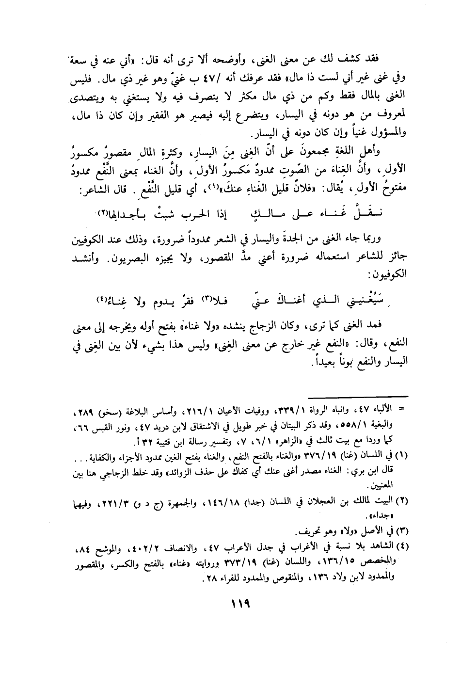 فمد الغني كما ترى، وكان الزجاج ينشده «ولا غناء» بفتح أوله ويخرجه إلى معنى النفع، وقال: «النفع غير خارج عن معنى الغنى» وليس هذا بشيء لأن بين الغنى في اليسار والنفع بونًا بعيدًا.