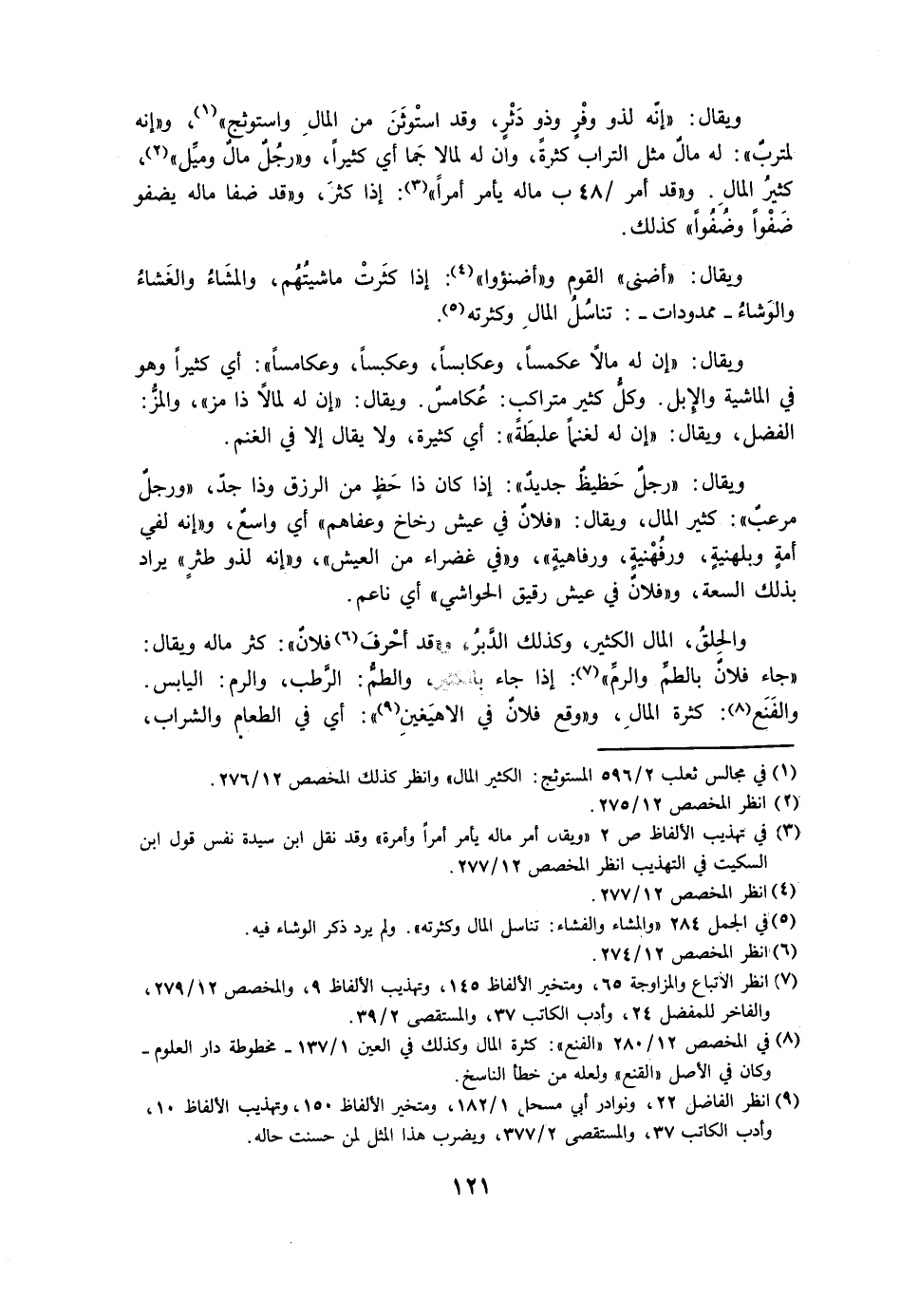 ويقال: «إنه لذو وفر وذو دثر، وقد استوثن من المال واستوثج»، و «إنه لمترب»: له مال مثل التراب كثرة، وإن له لمالا جما أي كثيرًا، و «رجل مال وميل»، كثير المال. و «قد أمر ماله يأمر أمرًا»: إذا كثر، و «قد ضفا ماله يضفوا ضفوًا وضفوًا» كذلك.