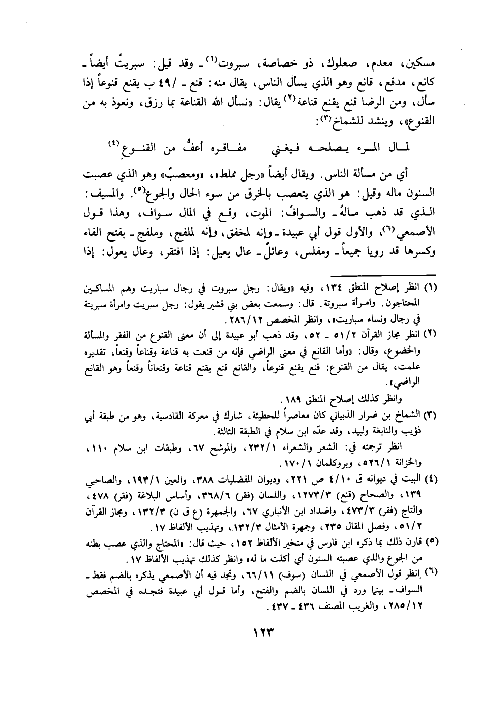 أي من مسألة الناس. ويقال أيضًا «رجل مملط»، «ومعصب» وهو الذي عصبت السنون ماله وقيل: هو الذي يتعصب بالخرق من سوء الحال والجوع. والمسيف: الذي قد ذهب ماله - والسواف: الموت، وقع في المال سواف، وهذا قول الأصمعي، والأول قول أبي عبيدة - وإنه لمخفق، وإنه لملفلج، وملفج - بفتح الفاء وكسرها قد رويا جميعًا - ومفلس، وعائل - عال يعيل: إذا افتقر، وعال يعول: إذا