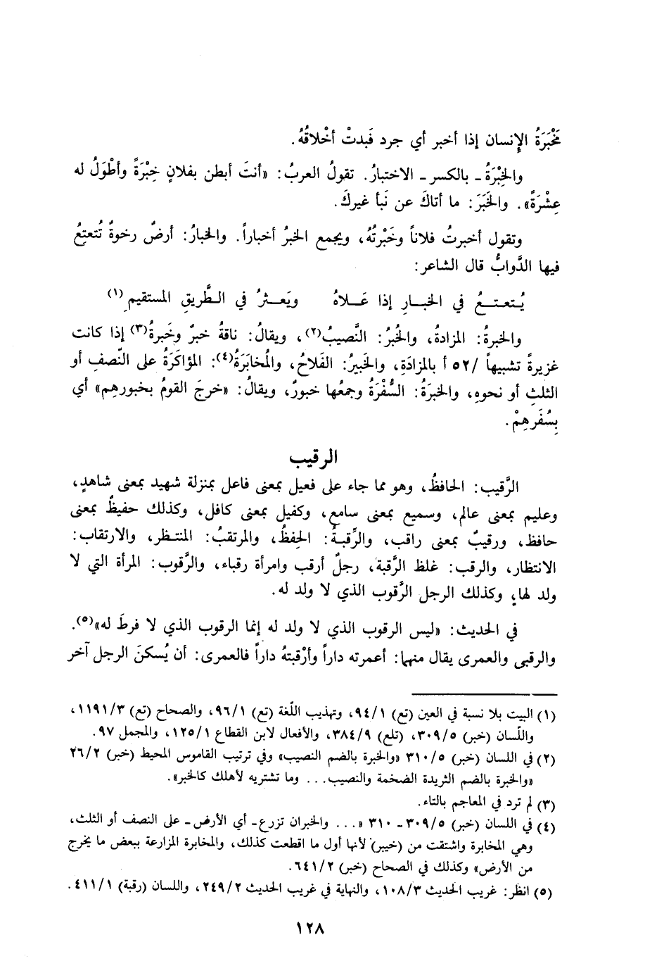 الرقيب: الحافظ، وهو مما جاء على فعيل بمعنى فاعل بمنزلة شهيد بمعنى شاهد، وعليم بمعنى عالم، وسميع بمعنى سامع، وكفيل بمعنى كافل، وكذلك حفيظ بمعنى حافظ، ورقيب بمعنى راقب، والرقبة: الحفظ، والمرتقب: المنتظر، والارتقاب: الانتظار، والرقب: غلظ الرقبة، رجل أرقب وامرأة رقباء، والرقوب: المرأة التي لا ولد لها، وكذلك الرجل الرقوب الذي لا ولد له.