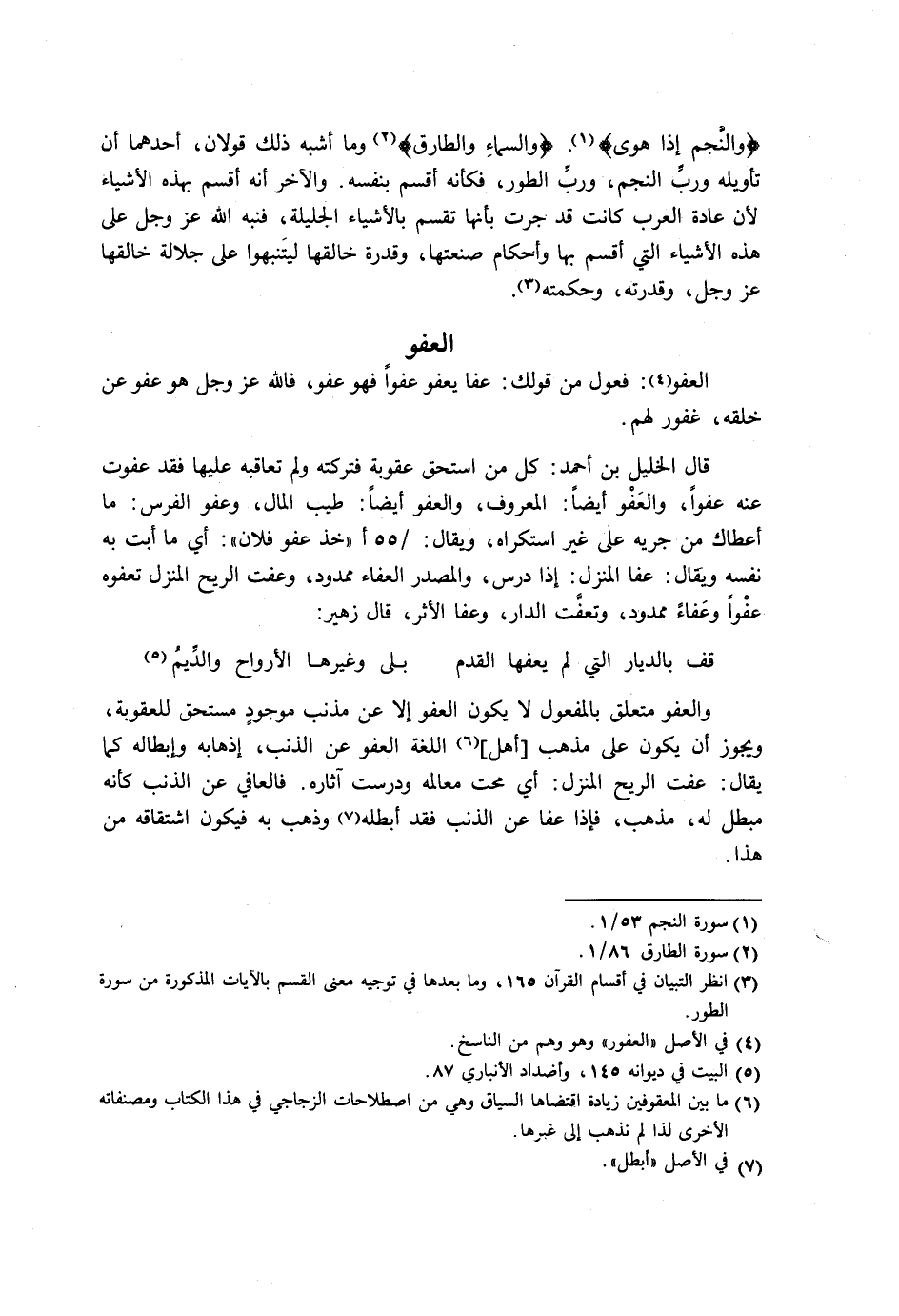 {والنجم إذا هوى}. {والسماء والطارق} وما أشبه ذلك قولان، أحدهما أن تأويله ورب النجم، ورب الطور، فكأنه أقسم بنفسه. والآخر أنه أقسم بهذه الأشياء لأن عادة العرب كانت قد جرت بأنها تقسم بالأشياء الجليلة، فنبه الله عز وجل على هذه الأشياء التي أقسم بها وأحكام صنعتها، وقدرة خالقها لتنبهوا على جلالة خالقها عز وجل، وقدرته، وحكمته.