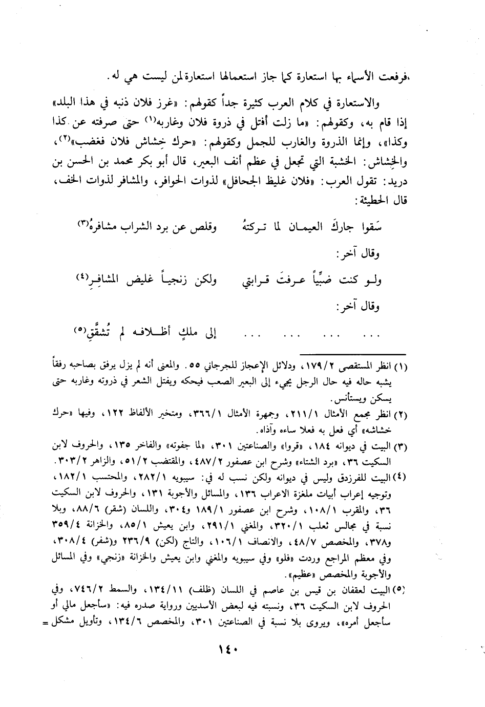 والاستعارة في كلام العرب كثيرة جدًا كقولهم: «غرز فلان ذنبه في هذا البلد» إذا قام به، وكقولهم: «ما زلت أفتل في ذروة فلان وغاربه حتى صرفته عن كذا وكذا»، وإنما الذروة والغارب للجمل وكقولهم: «حرك خشاش فلان فغضب»، والخشاش: الخشبة التي تجعل في عظم أنف البعير، قال أبو بكر محمد بن الحسن بن دريد: تقول العرب: «فلان غليظ الجحافل» لذوات الحوافر، والمشافر لذوات الخف، قال الحطيئة: