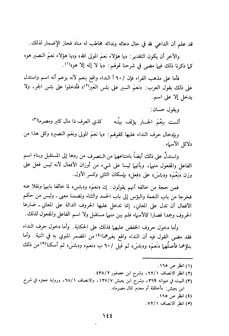 فأما على مذهب الفراء فإن النداء واقع بنعم لأنه يزعم أنه اسم واستدل على ذلك بقول العرب: «نعم السير على بئس العير» فأدخلوا على بئس الجر، ولا يدخل إلا على اسم.