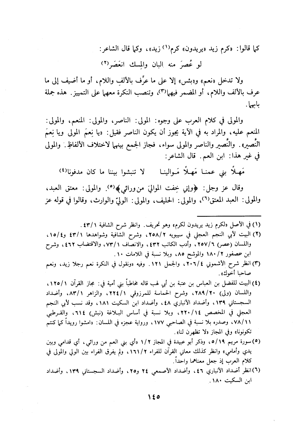 والمولى في كلام العرب على وجوه: المولى: الناصر، والمولى: المنعم، والمولى: المنعم عليه، والمراد به في الآية يجوز أن يكون الناصر فقيل: «يا نعم المولى ويا نعم النصير». والنصير والناصر والمولى سواء، فجاز الجمع بينهما لاختلاف الألفاظ. والمولى في غير هذا: ابن العم. قال الشاعر: