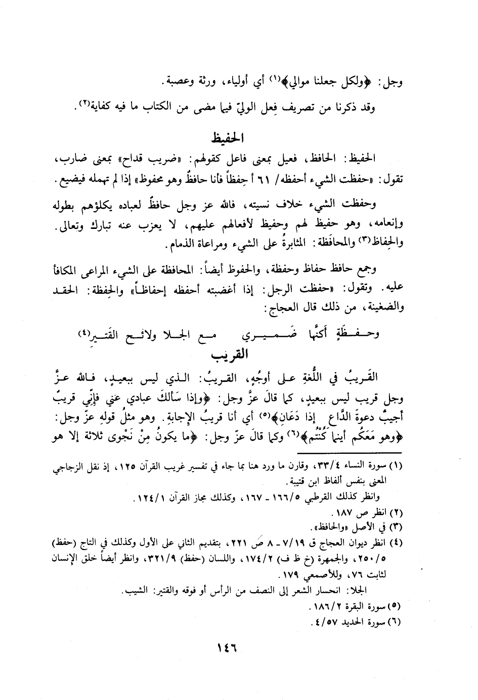 وجمع حافظ حفاظ وحفظة، والحفوظ أيضًا: المحافظة على الشيء المراعي المكافأ عليه. وتقول: «حفظت الرجل: إذا أغضبته أحفظه إحفاظًا» والحفظة: الحقد والضغينة، من ذلك قال العجاج: