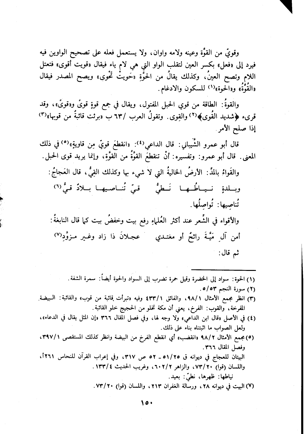 قال أبو عمرو الشيباني: قال الداعي: «انقطع قوي من قاوية» في ذلك المعنى. قال أبو عمرو: وتفسيره: أن تنقطع القوة من القوة، وإنما يريد قوى الحبل.