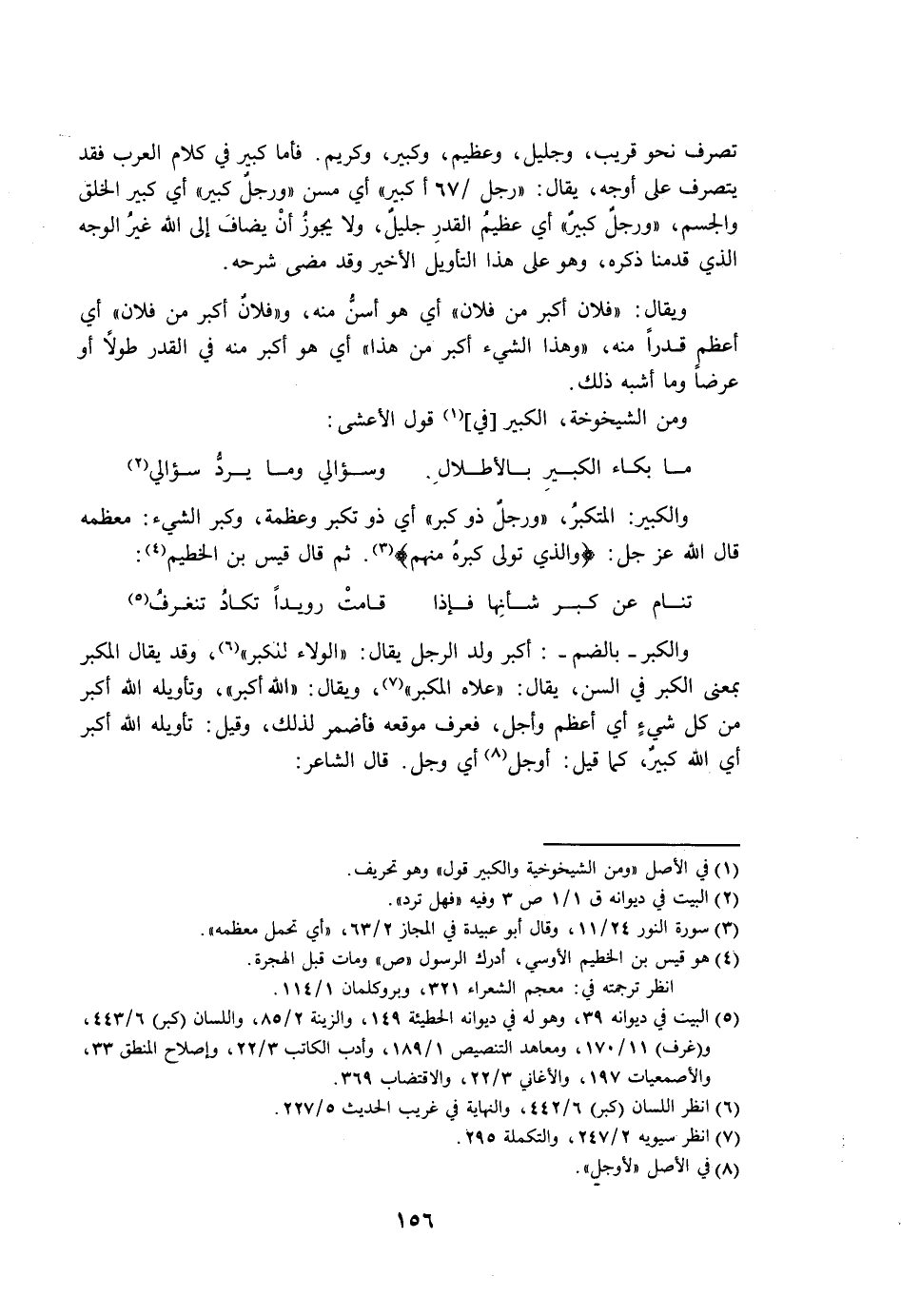 تصرف نحو قريب، وجليل، وعظيم، وكبير، وكريم. فأما كبير في كلام العرب فقد يتصرف على أوجه، يقال: «رجل كبير» أي مسن «ورجل كبير» أي كبير الخلق والجسم، «ورجل كبير» أي عظيم القدر جليل، ولا يجوز أن يضاف إلى الله غير الوجه الذي قدمنا ذكره، وهو على هذا التأويل الأخير وقد مضى شرحه.