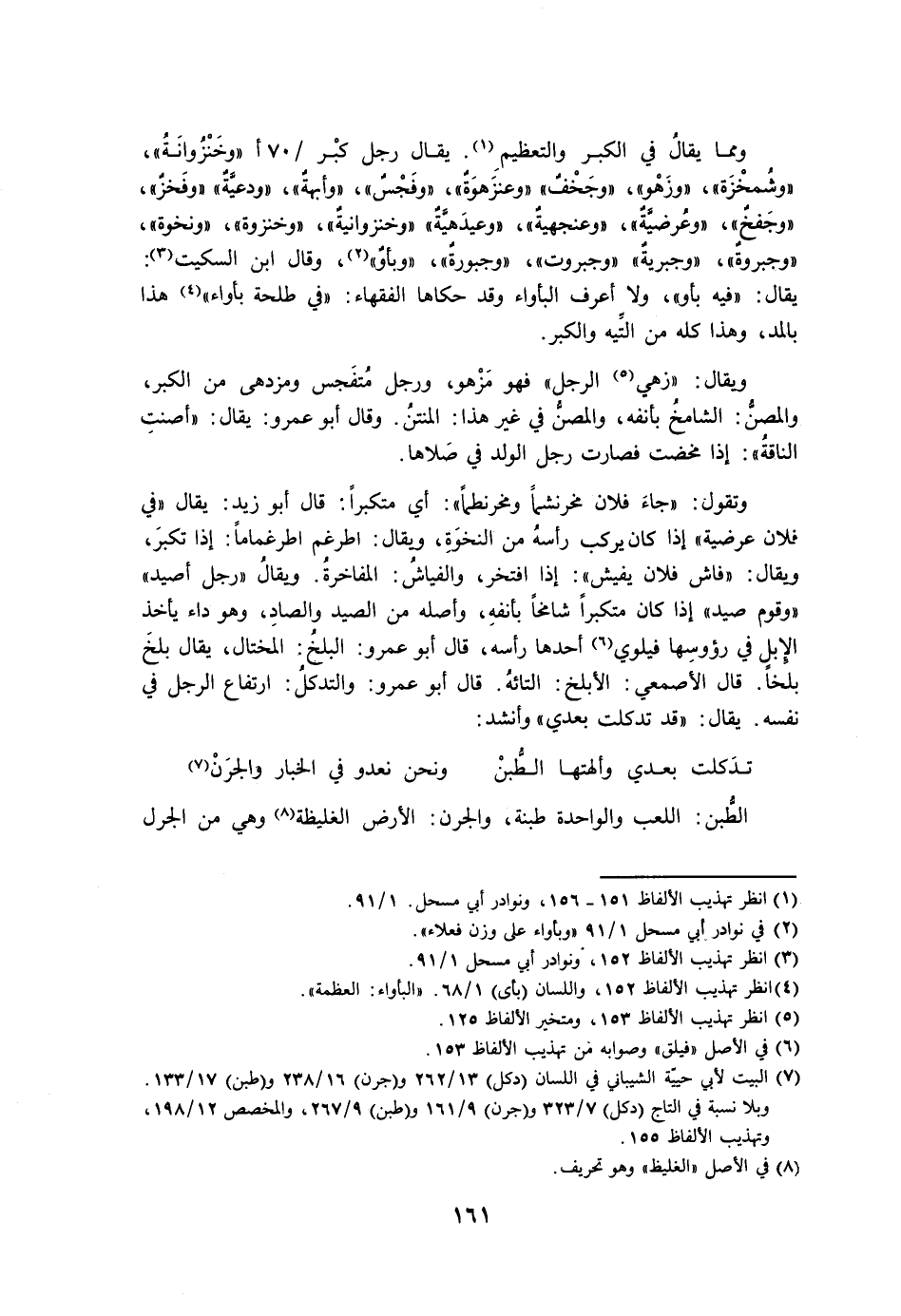 ومما يقال في الكبر والتعظيم. يقال رجل كبر «وخنزوانة»، «وشمخزة»، «زوهو»، «وجخف» «وعنزهوة»، «وفجس»، «وأبهة»، «ودعية» «وفخز»، «وجفخ»، «وعرضية»، «وعنجهية»، «وعيدهية» «وخنزوانية»، «وخنزوة»، «ونخوة»، «وجبروة»، «وجبرية» «وجبروت»، «وجبورة»، «وبأو»، وقال ابن السكيت: يقال: «فيه بأو»، ولا أعرف البأواء وقد حكاها الفقهاء: «في طلحة بأواء» هذا بالمد، وهذا كله من التيه والكبر.
