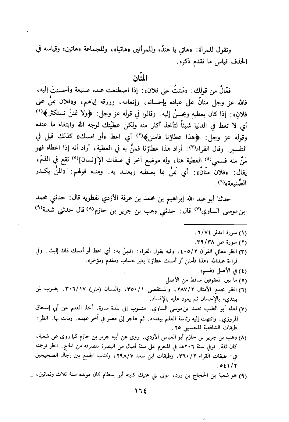 حدثنا أبو عبد الله إبراهيم بن محمد بن عرفة الأزدي نفطويه قال: حدثني محمد ابن موسى الساوي قال: حدثني وهب بن جرير بن حازم قال حدثني شعبة