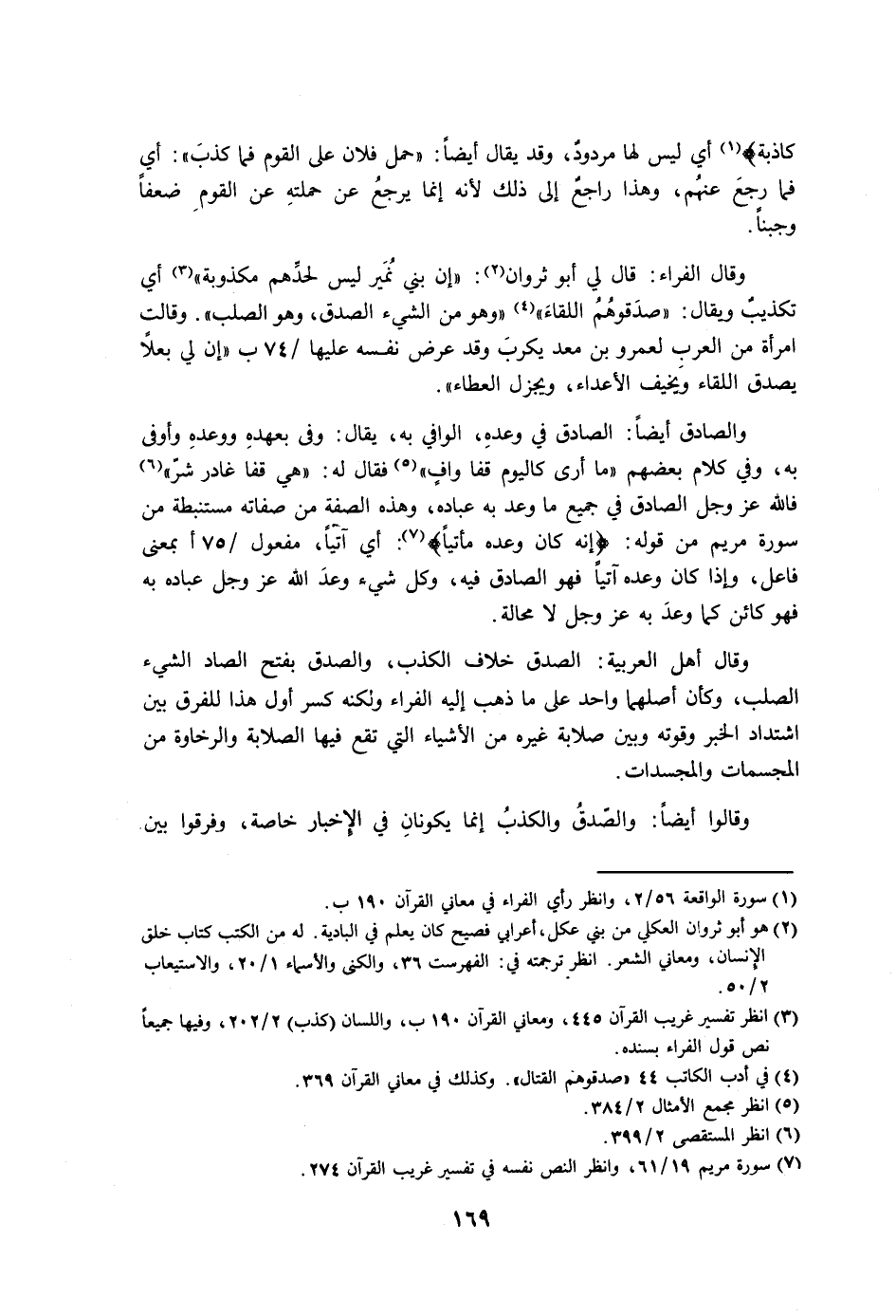 وقال الفراء: قال لي أبو ثروان: «إن بني نمير ليس لحدهم مكذوبة» أي تكذيب ويقال: «صدقوهم اللقاء» «وهو من الشيء الصدق، وهو الصلب». وقالت امرأة من العرب لعمرو بن معد يكرب وقد عرض نفسه عليها «إن لي بعلاً يصدق اللقاء ويخيف الأعداء، ويجزل العطاء».