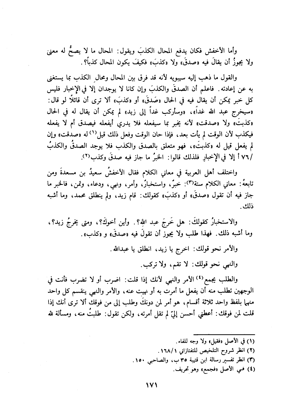 والقول ما ذهب إليه سيبويه لأنه قد فرق بين المحال ومحال الكذب بما يستغنى به عن إعادته. فاعلم أن الصدق والكذب وإن كانا لا يوجدان إلا في الإخبار فليس كل خبر يمكن أن يقال فيه في الحال «صدق» أو «كذب» ألا ترى أن قائلاً لو قال: «سيخرج عبد الله غدًا»، «وسأركب غدًا إلى زيد» لم يمكن أن يقال له في الحال «كذبت» ولا «صدقت» لأنه يخبر بما سيفعله فلا يدري أيفعله فيصدق أم لا يفعله فيكذب لأن الوقت لم يأت بعد، فإذا حان الوقت وفعل ذلك قيل له «صدقت» وإن لم يفعل قيل له «كذبت»، فهو متعلق بالصدق والكذب فلا يوجد الصدق والكذب إلا في الإخبار فلذلك قالوا: الخبر ما جاز فيه صدق وكذب.