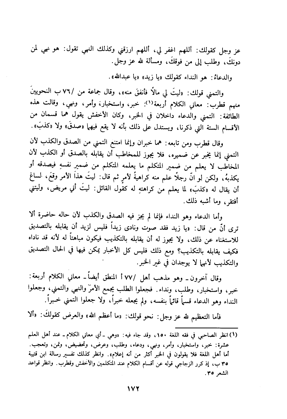 وقال آخرون - وهو مذهب أهل المنطق أيضًا - معاني الكلام أربعة: خبر، واستخبار، وطلب، ونداء. فجعلوا الطلب يجمع الأمر والنهي والتمني، وجعلوا النداء وهو الدعاء قسمًا قائمًا بنفسه، ولم يجعله خبرًا، ولا جعلوا التمني خبرًا.