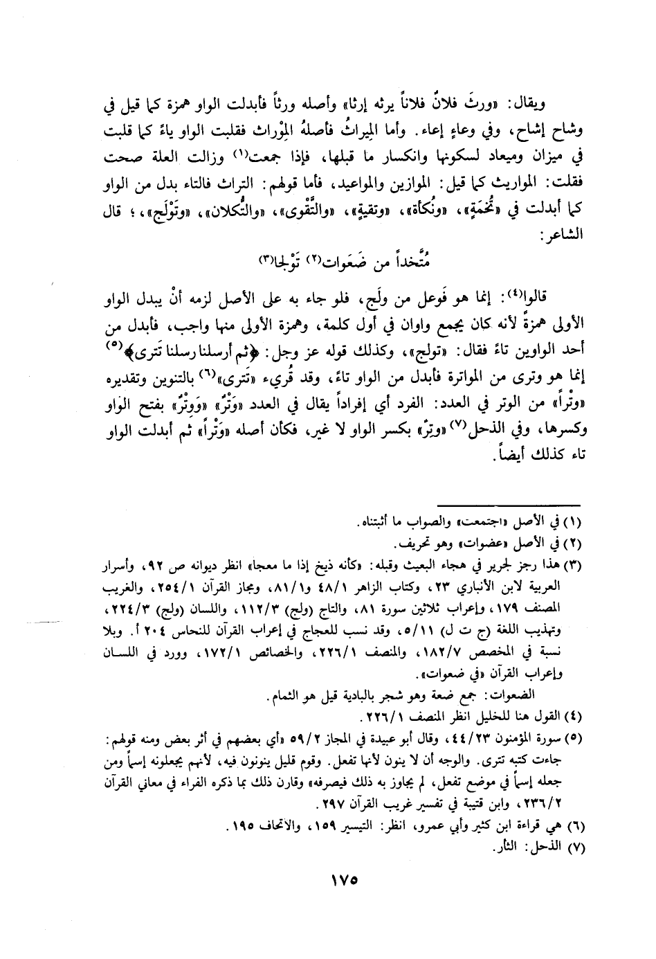 ويقال: «ورث فلان فلانًا يرثه إرثًا» وأصله ورثًا فأبدلت الواو همزة كما قيل في وشاح إشاح، وفي وعاء إعاء. وأما الميراث فأصله الموراث فقلبت الواو ياء كما قلبت في ميزان وميعاد لسكونها وانكسار ما قبلها، فإذا جمعت وزالت العلة صحت فقلت: المواريث كما قيل: الموازين والمواعيد، فأما قولهم: التراث فالتاء بدل من الواو كما أبدلت في «تخمة»، «ونكأة»، «وتقية»، «والتقوى»، «والتكلان»، «وتولوج»، قال الشاعر: