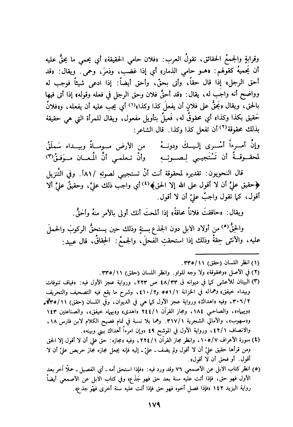 وقرابة والجمع الحقائق، تقول العرب: «فلان حامي الحقيقة» أي يحمي ما يحق عليه أن يحميه كقولهم: «هو حامي الذمار» أي إذا غضب، وذمر، وحمى. ويقال: «قد أحق الرجل» إذا قال حقًا وأتى بحق، وأحق أيضًا: إذا ادعى شيئًا فوجب له وواضح أنه واجب له، يقال: «قد أحق فلان وحق الرجل في فعله وقوله» إذا أتى فيها بالحق، ويقال «يحق على فلان أن يفعل كذا وكذا» أي يجب عليه أن يفعله، و «فلان حقيق بكذا وكذا» أي محقوق له، فعيل بتأويل مفعول، ويقال للمرأة التي هي حقيقة بذلك محقوقة أن تفعل كذا وكذا. قال الشاعر: