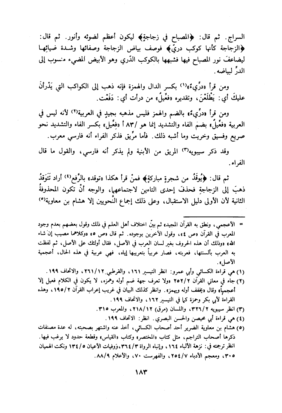 ومن قرأ «درئ» بالضم والهمز فليس مذهبه بجيد في العربية لأنه ليس في العربية «فعيل» بضم الفاء والتشديد إنما هو «فعيل» بكسر الفاء والتشديد نحو صريع وفسيق وخريت وما أشبه ذلك. فأما مريق فذكر الفراء أنه فارسي معرب.
