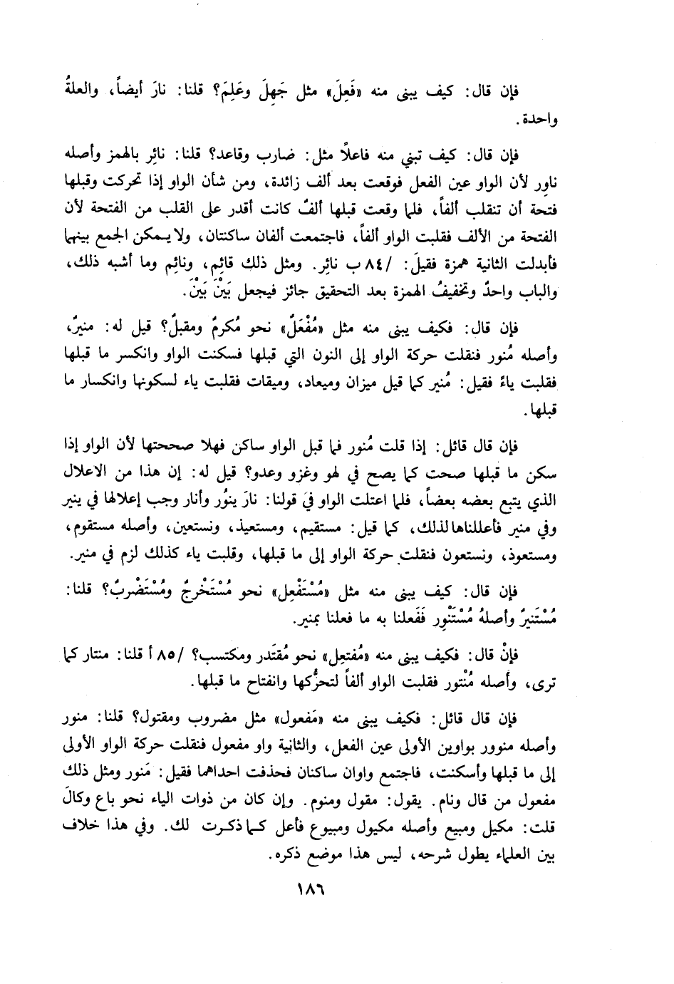 فإن قال قائل: فكيف يبني منه «مفعول» مثل مضروب ومقتول؟ قلنا: منور واصله منور بواوين الأولى عين الفعل، والثانية واو مفعول فنقلت حركة الواو الأولى إلى ما قبلها وأسكنت، فاجتمع واوان ساكنان فحذفت إحداهما فقيل: منور ومثل ذلك مفعول من قال ونام. يقول: مقول ومنوم. وإن كان من ذوات الياء نحو باع وكال قلت: مكيل ومبيع وأصله مكيول ومبيوع فأعل كما ذكرت لك. وفي هذا خلاف بين العلماء يطول شرحه، ليس هذا موضع ذكره.