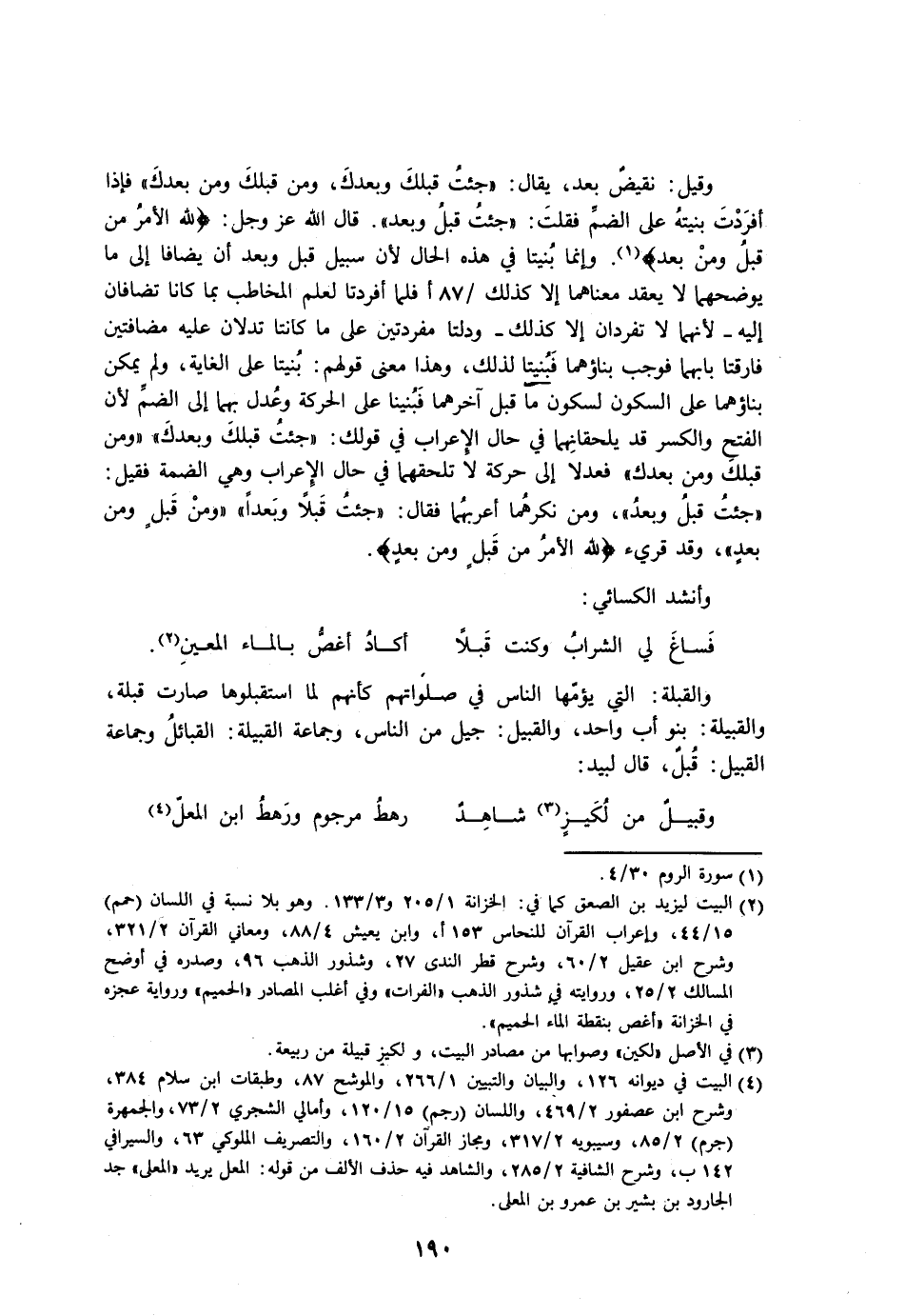وقيل: نقيض بعد، يقال: «جئت قبلك وبعدك، ومن قبلك ومن بعدك» فإذا أفردت بنيته على الضم فقلت: «جئت قبل وبعد». قال الله عز وجل: {لله الأمر من قبل ومن بعد}. وإنما بنيتا في هذه الحال لأن سبيل قبل وبعد أن يضافا إلى ما يوضحهما لا يعقد معناهما إلا كذلك فلما أفردتا لعلم المخاطب بما كانا تضافان إليه - لأنهما لا تفردان إلا كذلك - ودلتا مفردتين على ما كانتا تدلان عليه مضافتين فارقتا بابهما فوجب بناؤهما فبنيتا لذلك، وهذا معنى قولهم: بنيتا على الغاية، ولم يكن بناؤهما على السكون لسكون ما قبل آخرهما فبنينا على الحركة وعدل بهما إلى الضم لأن الفتح والكسر قد يلحقانهما في حال الإعراب في قولك: «جئت قبلك وبعدك» «ومن قبلك ومن بعدك» فعدلا إلى حركة لا تلحقهما في حال الإعراب وهي الضمة فقيل: «جئت قبل وبعد»، ومن نكرهما أعربهما فقال: «جئت قبلا وبعدا» «ومن قبل ومن بعد»، وقد قرئ {لله الأمر من قبل ومن بعد}.